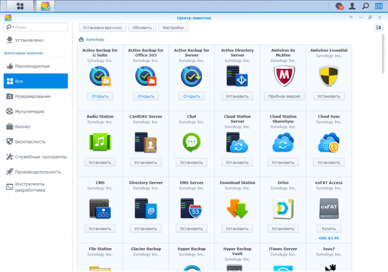 Всего в каталоге дополнительных приложений для данной модели на момент подготовки статьи было представлено 55 программ Synology и 63 программы сторонних разработчиков. Отдельно стоит отметить наличие фирменных утилит-клиентов для мобильных устройств, позволяющих иметь доступ к файлам и сервисам в любое время из любого места, если вы подключены к интернету.