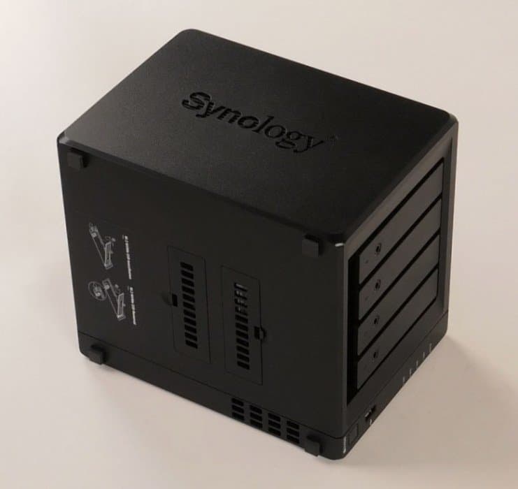 В последний, кроме самого накопителя, входят: внешний блок питания (12 В 8,33 А), кабель питания, два сетевых патчкорда, винты для крепления дисков формата 2,5″, два ключа для замков дисковых отсеков, краткая инструкция по началу работы «в картинках», листовка по собственному облачному сервису хранения данных Synology. Вполне стандартный вариант: кроме винчестеров вам больше ничего не потребуется.