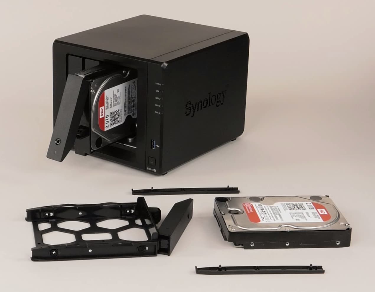 Вид передней панели напоминает выпущенные лет пять назад устройства. Бо́льшую ее часть занимают отсеки для дисков. Они ничем не закрыты, в отличие от устройств прошлого поколения, но на рамках предусмотрены дополнительные защелки. Через щели вокруг них внутрь корпуса поступает воздух для охлаждения. Жаль, что компания не реализовала какого-нибудь варианта защиты от пыли. Можно было бы предложить, например, сетку на быстросъемных магнитных креплениях. Даже если это немного портило внешний вид, пользы было бы немало.