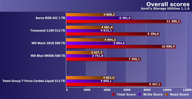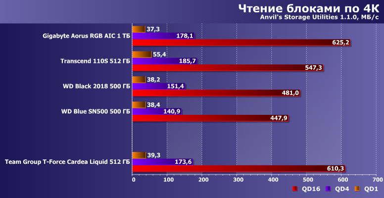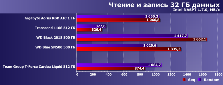 Как уже не раз было отмечено, логика работы современных контроллеров Phison и Silicon Motion идеально «подогнана» к тестам низкого уровня, что делает основанные на них накопители потенциальными фаворитами. Всегда — если не помешают другие факторы: например, в Transcend используются довольно медленные чипы памяти, WD Blue ограничен интерфейсом и т. п. Ну а Cardea Liquid (впрочем, как и Cardea II или совсем недорогой МР34 — аппаратно-то они одинаковые) ничего не мешает быть лучшим в своем классе. Но в своем — понятно, что большее количество кристаллов памяти в терабайтном Aorus сразу же делает его недостижимым на операциях записи.