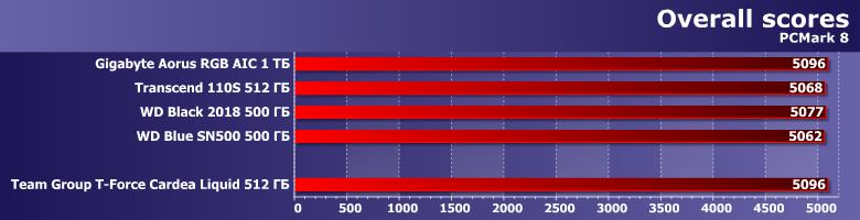 Как уже не раз было сказано, такие тесты — лучшее, что может случиться в жизни бюджетных SSD, поскольку реальные запросы прикладного ПО пока еще отстают от их возможностей. Правда искать в таких условиях аргументы в пользу покупки NVMe-накопителя очень сложно, но если недорогого — отчего бы и нет? А тут интересным является то, что из всех пяти участников один из самых недорогих — еще и самый быстрый. Что, впрочем, не так уж неожиданного: размер и частота DRAM вряд ли могут сказаться на результатах, а вот большой SLC-кэш — вполне. При том, что в PCMark вообще устройства на базе Phison E12/E16 на фоне прочих смотрятся очень хорошо, фактически нашему главному герою приходится «сражаться» разве что с Aorus — а у него и это получается.