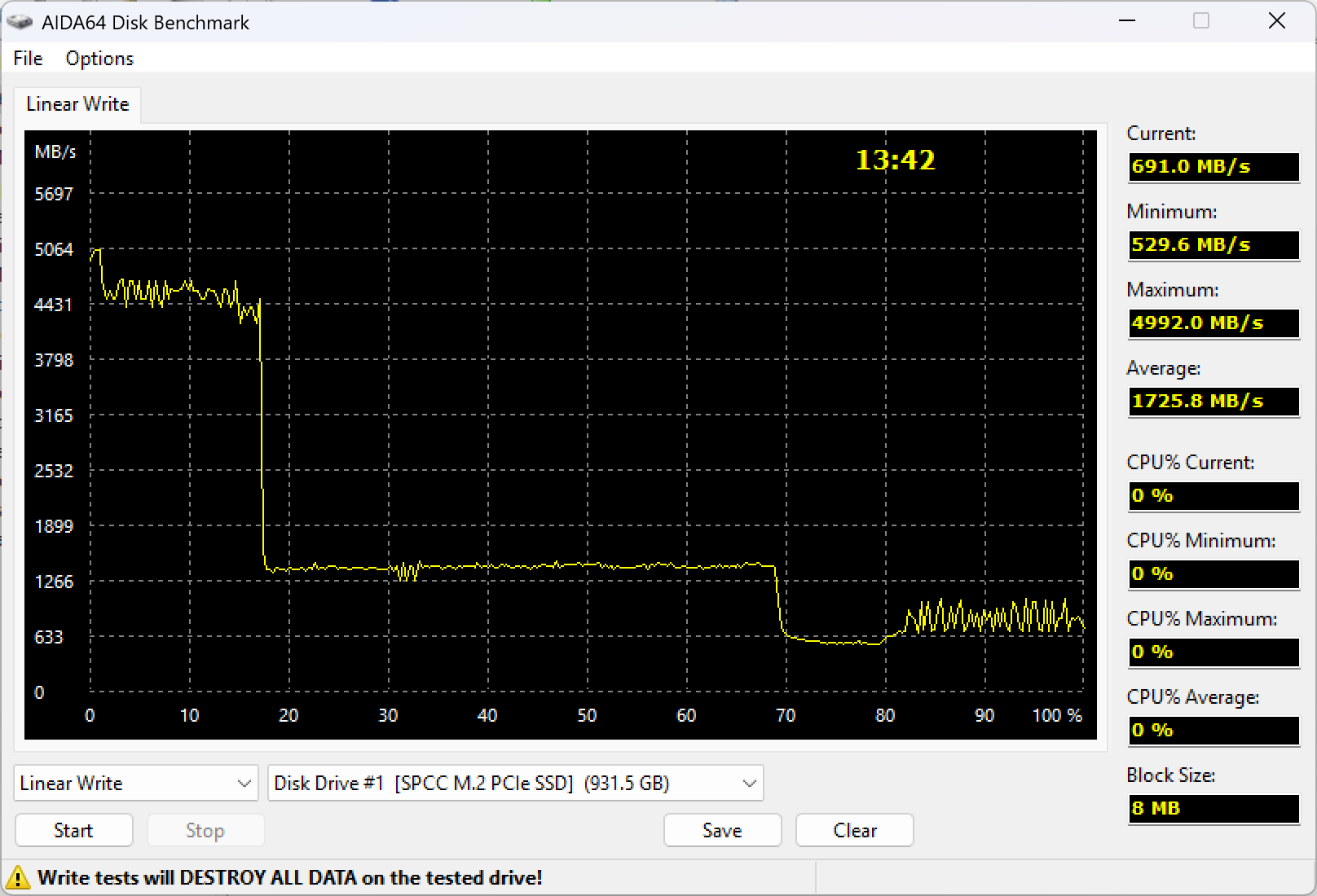 Проявляется это иногда и в такой простой дисциплине, как полная пропись данными. Общие принципы, впрочем, не меняются и хорошо видны на графике. Максимальная скорость записи — в пределах статической части SLC-кэша, далее динамика в размере половины или трети свободных ячеек (конкретный размер настраивает производитель), переход на режим прямой записи во флэш, расчистка кэша.