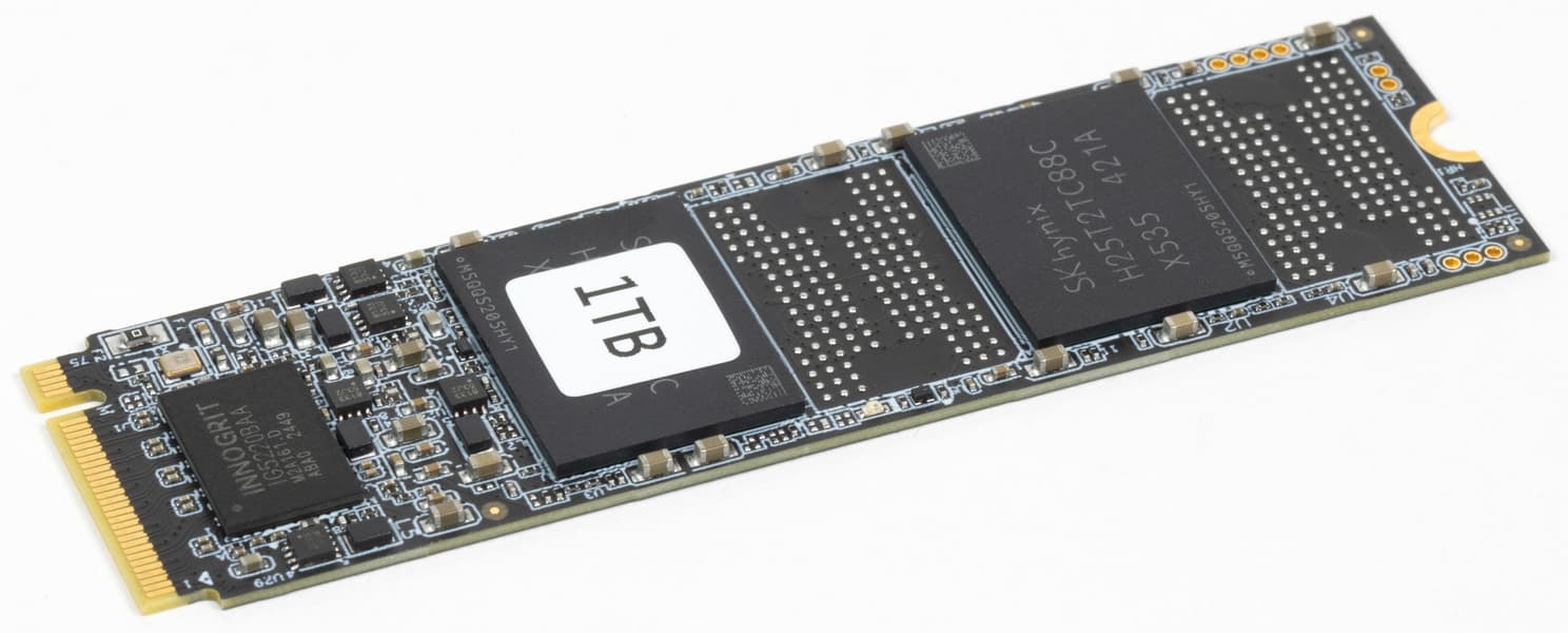Поэтому вне зависимости от конкретного названия модели (с ними на большей части рынка та еще неразбериха) сама по себе эта платформа универсальна — и в пир, и в мир. И в ноутбук, например — никаких проблем с режимами энергосбережения (чем иногда грешат мелкие производители) здесь нет. Конкретная память — 176-слойный TLC-флэш SK Hynix с 4-plane кристаллами по 512 Гбит. Спаренными в сборки по 1 Тбит, что при такой емкости не нужно, но это следствие унификации — напомним, что максимальная емкость T-Force G50 составляет 4 ТБ, а там без этого не обойдешься. Память, как мы уже знаем, достаточно быстрая, пусть и не самая скоростная на рынке. С контроллерами этого класса не только достигает пиковых 5 ГБ/с (прописанных в спецификациях), но и неплохо ведет себя в любых сценариях, в том числе и отличных от последовательных. Нового для нас сегодня будет ее использование совместно с контроллером InnoGrit IG5220. Который, как уже сказано, остается для нас своеобразным белым пятном — почти ничего на нем основанного не тестировали. Вот и исправим этот пробел.