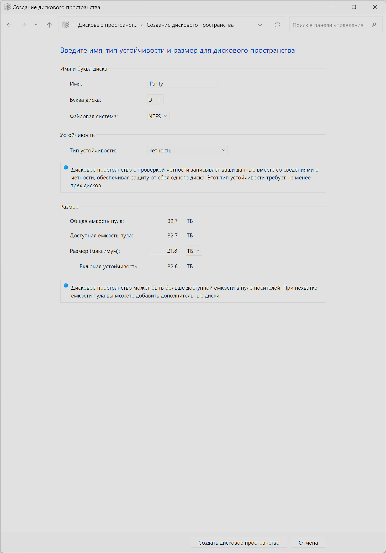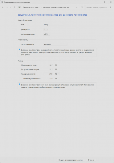 Четность — эквивалент RAID5/6, массив с резервированием контрольных сумм. В трех- и четырехдисковых массивах на это расходуется емкость одного, а в пяти- и шестидисковых — двух накопителей.