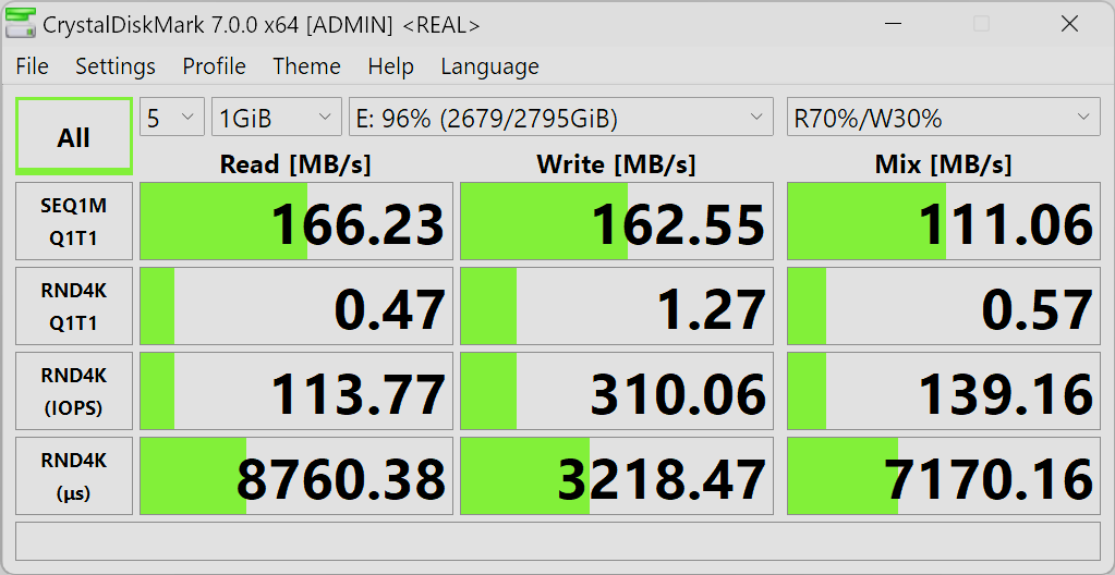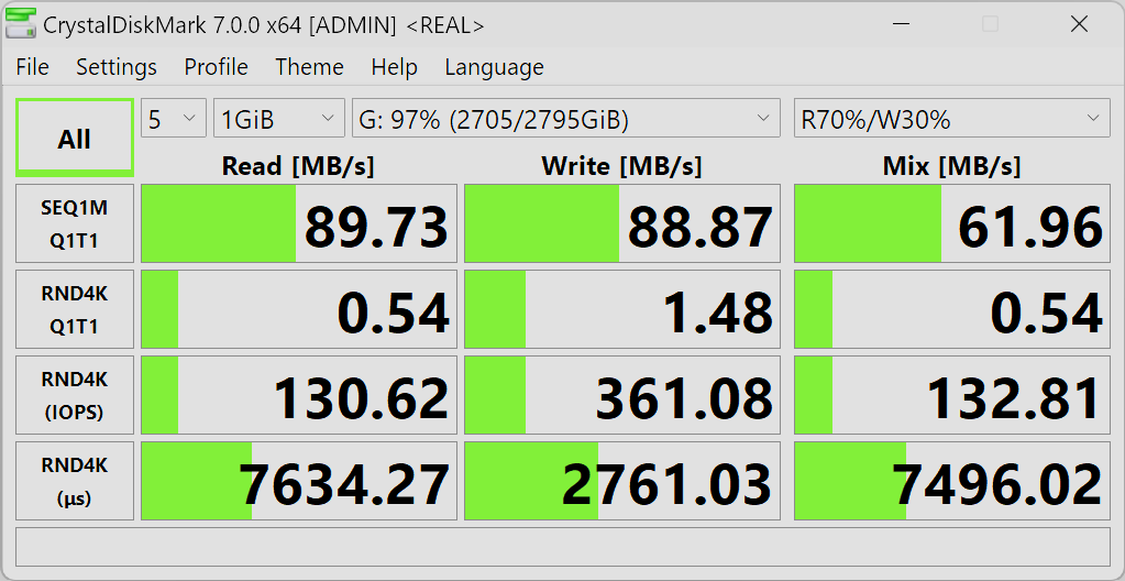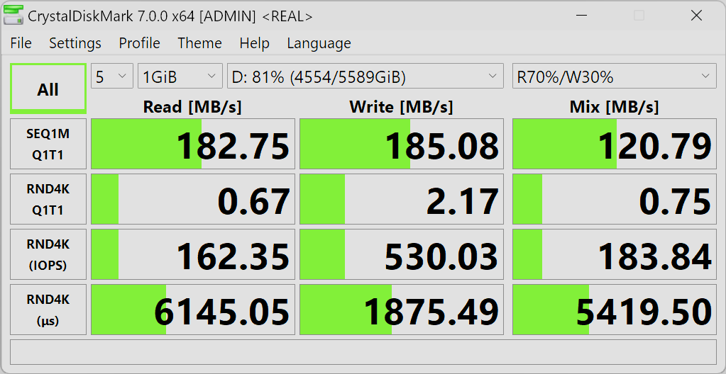 Очевидно, что при работе с накопителями скорости чтения и записи ограничены их аппаратными возможностями и интерфейсами SATA. В случае с Samsung 870 QVO внешний USB 3.2 Gen2 мог бы показать более высокие скорости, но это все-таки устройство с многоуровневой структурой ячеек, что накладывает известные ограничения.