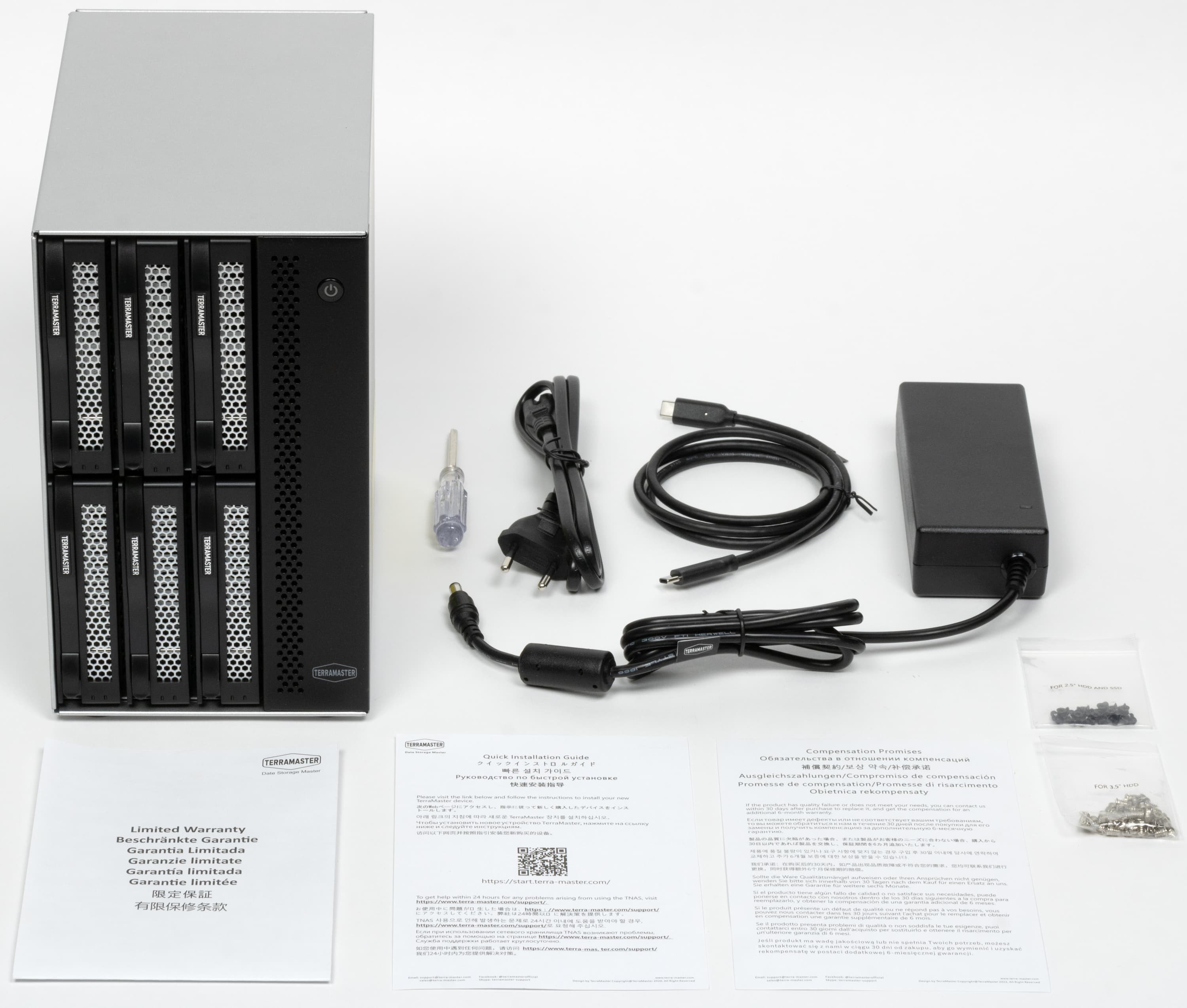 Вместе с устройством поставляются адаптер питания с разъемным кабелем, кабель USB Type-C, два комплекта винтов и отвертка.