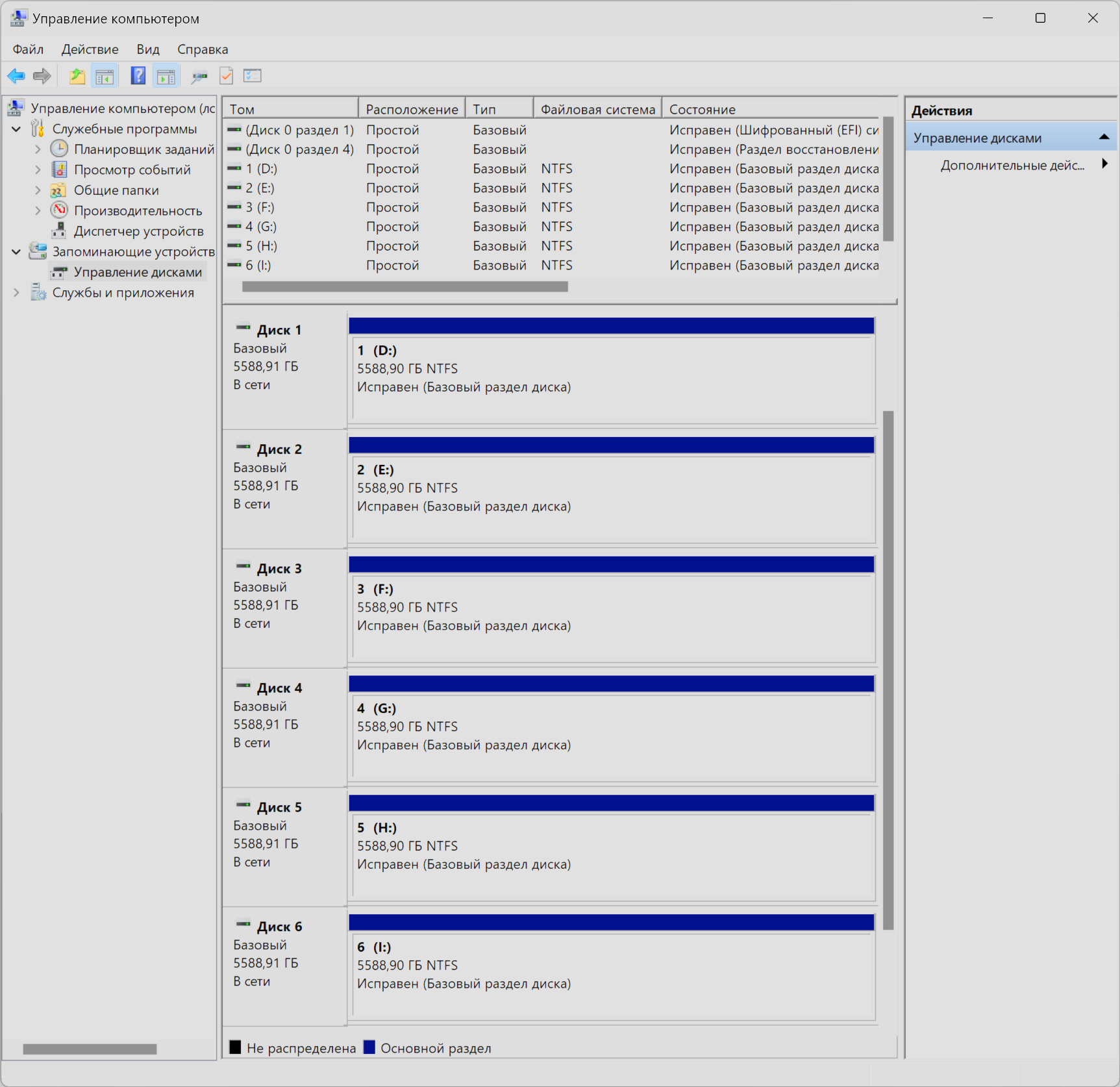 Вначале инициализируем накопители при помощи раздела «Управление дисками» утилиты «Управление компьютером», а затем объединим их в общий пул хранения.