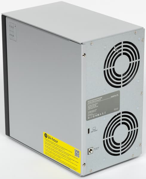 Сзади видны щели за двумя вентиляторами, прокачивающими воздух через отсеки накопителей в направлении спереди назад, единственный порт USB Type-C (маркировка 10Gbps) и коаксиальный разъем для подключения адаптера питания.