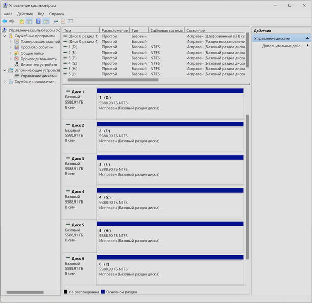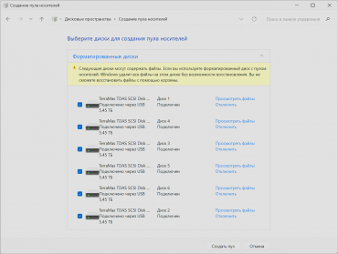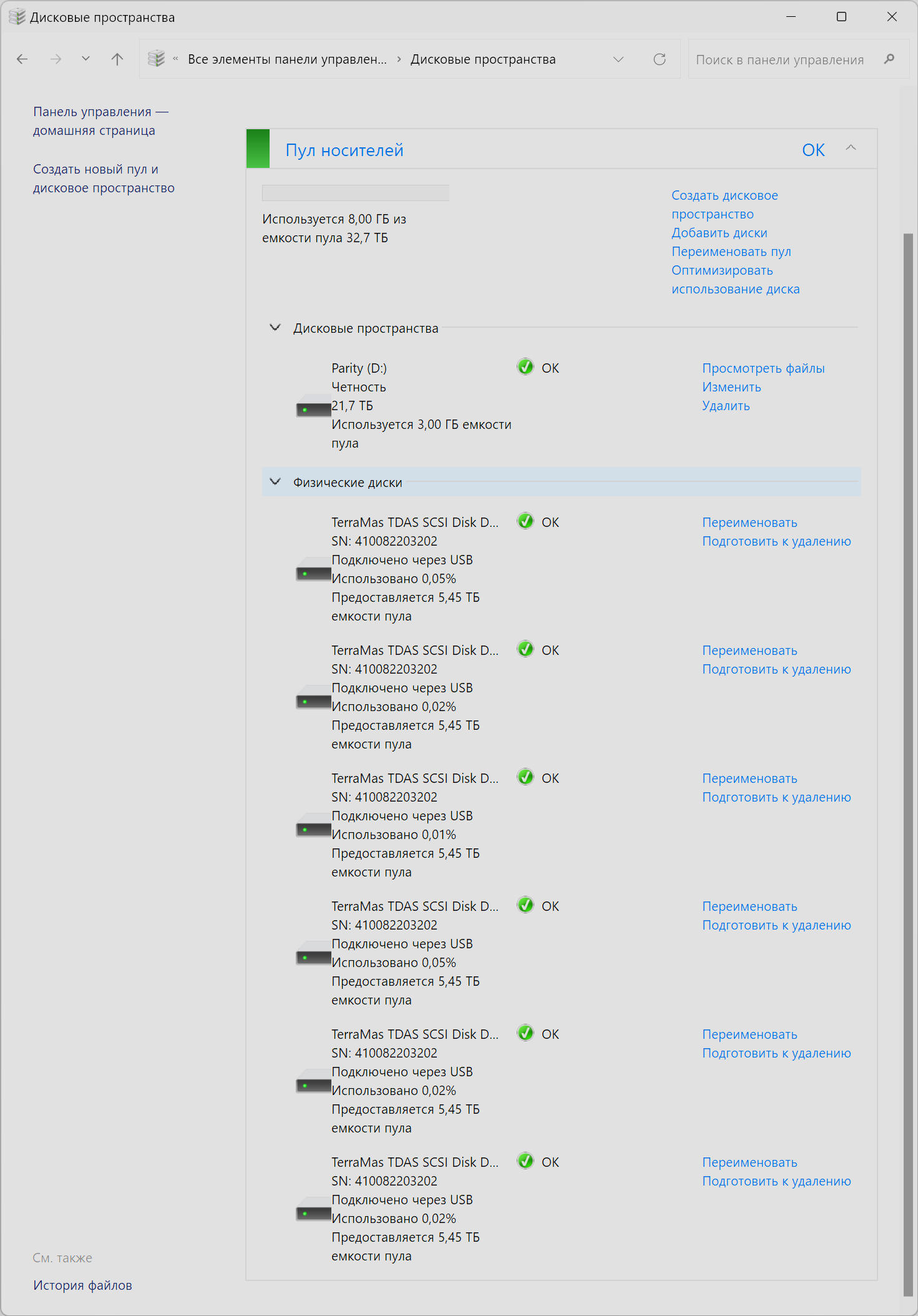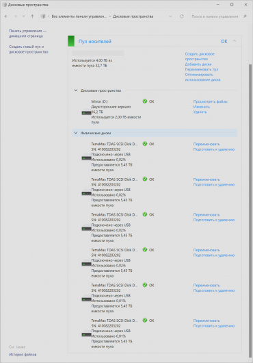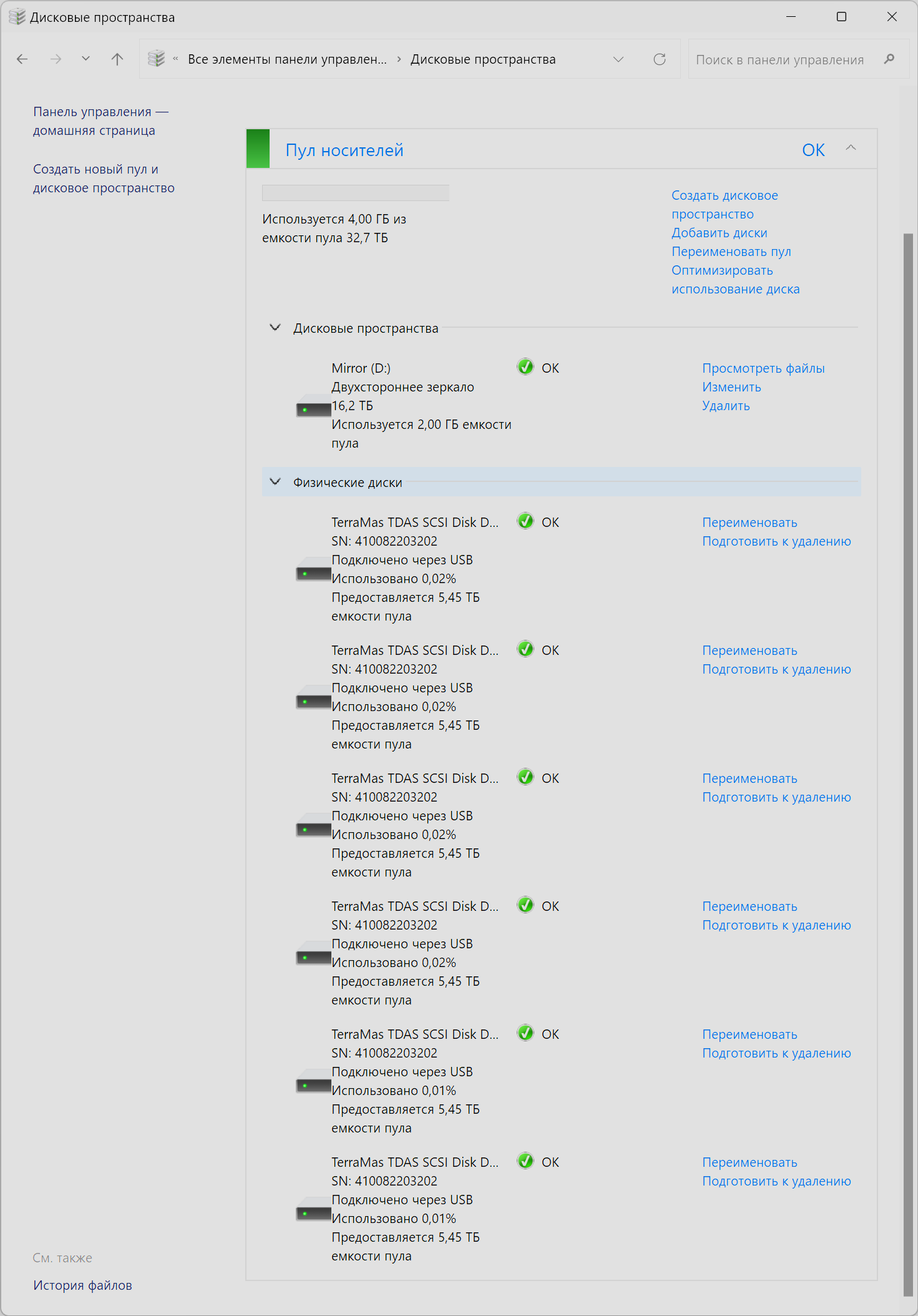 Диски №№ 2 и 6 выбиваются из общего ряда. Однако заменить их нечем, поэтому придется работать с тем, что имеется. Поскольку Terramaster D6-320 не обладает аппаратной поддержкой дисковых массивов, мы воспользуемся встроенными средствами Windows 11 («Управление дисками» и «Дисковые пространства»).