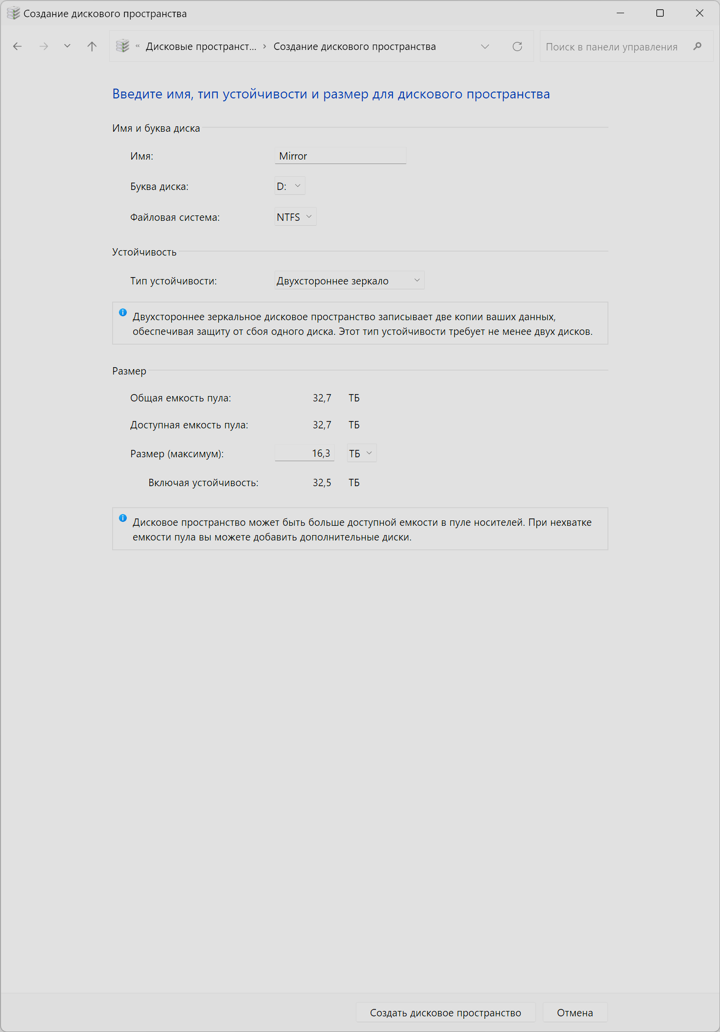 Конфигурация должна содержать четное число устройств. Вместимость массива равна половине суммарной емкости составляющих его дисков (в нашем случае — 16,2 ГБ).