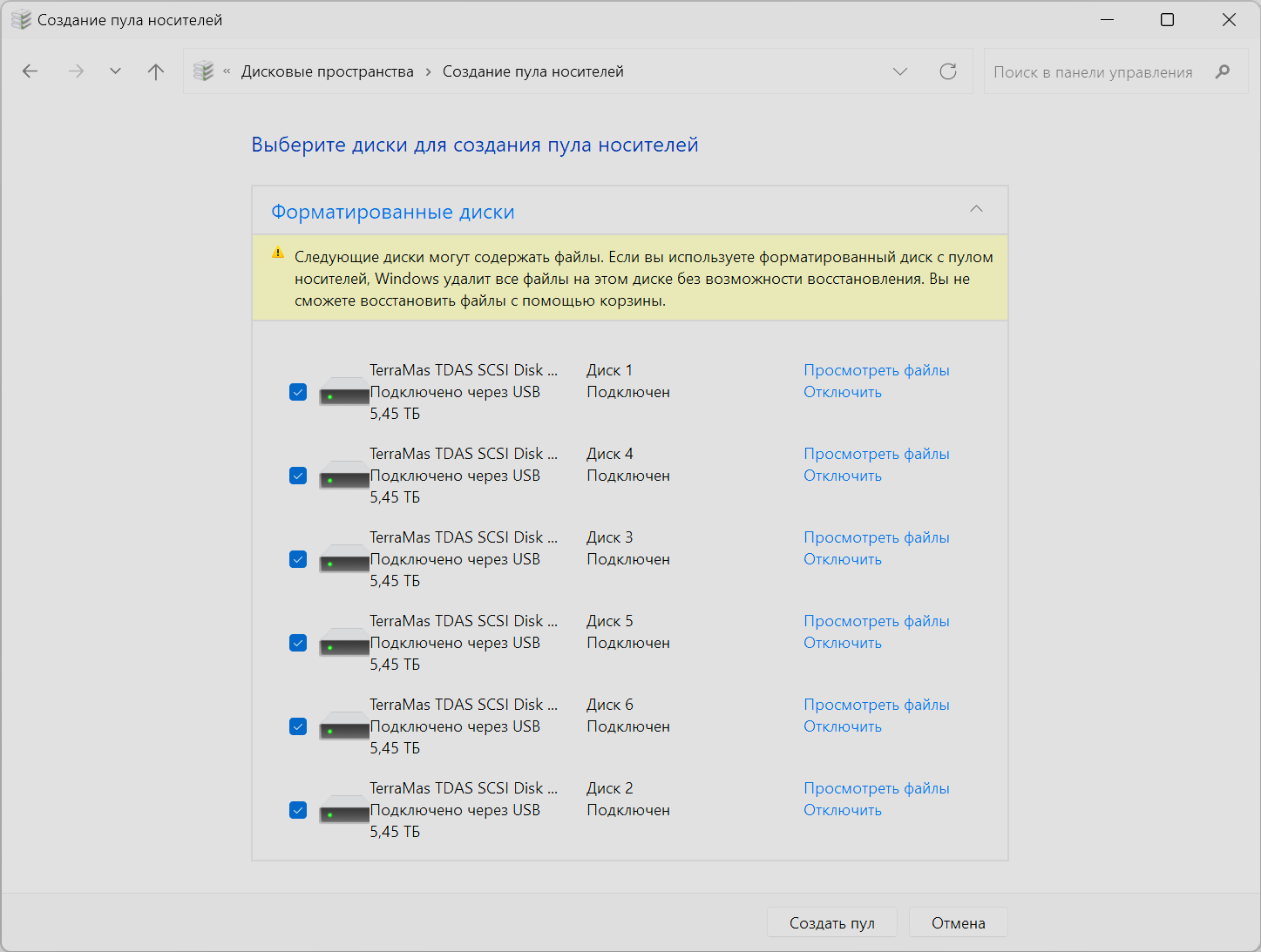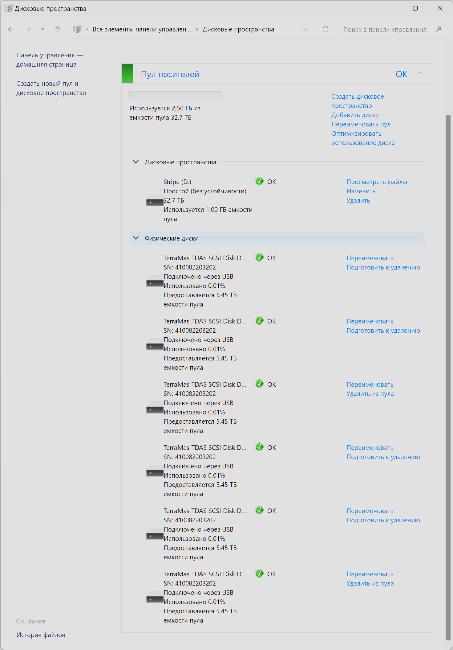 Вместимость простого массива (6 накопителей по 6 ТБ) после его форматирования составляет 32,7 ГБ.
