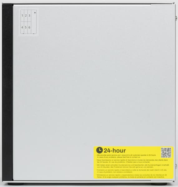 На правую стенку наклеены два стикера: в верхнем левом углу со схемой нумерации отсеков устройства, а по диагонали от него. внизу, — сообщение о 24-часовой задержке в ответ на обращении в сервисную службу производителя.