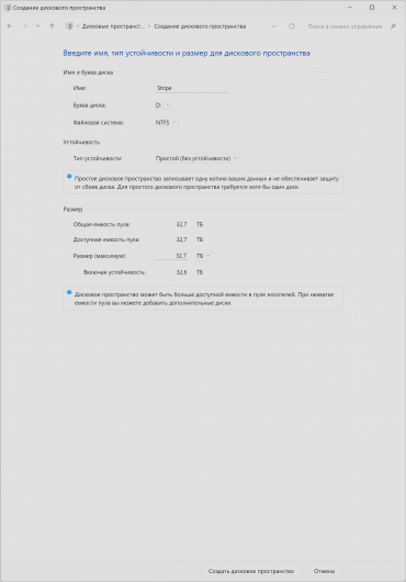 Простой (без устойчивости) — эквивалент RAID0 (Stripe) с объединением дисков в одно виртуальное устройство, емкость которого равна сумме вместимости всех отформатированных накопителей, но резервирования данных у такого дискового пространства нет. При сбое любого из дисков вся хранящаяся информация будет утрачена.