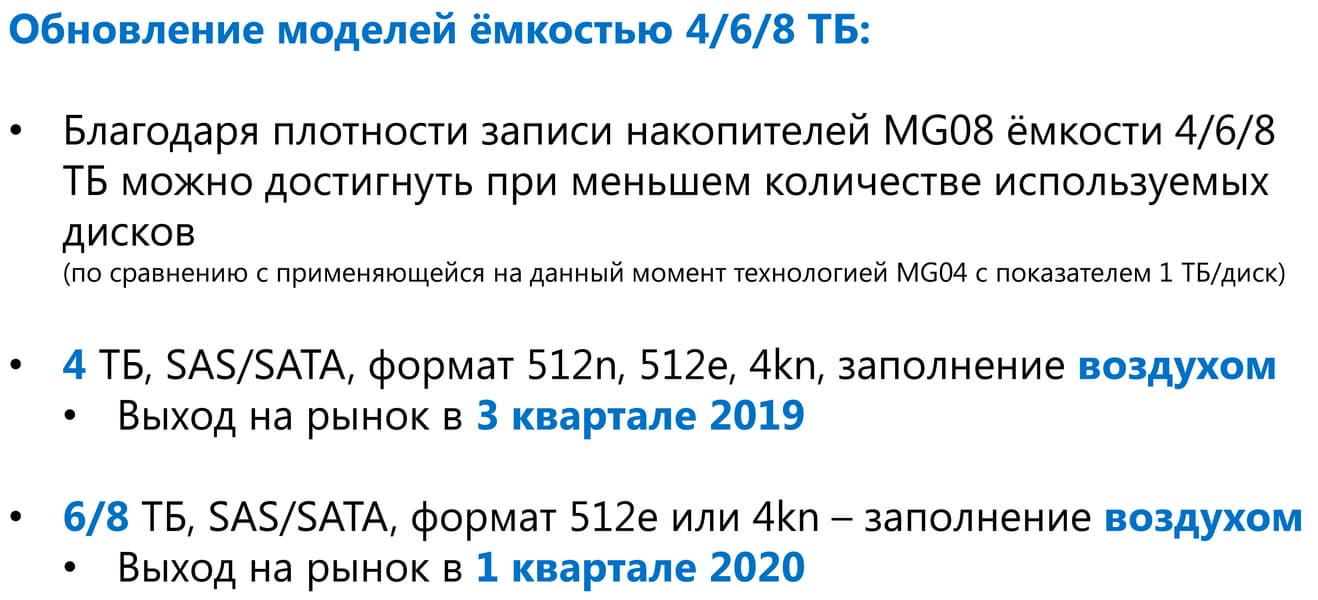 Поэтому и все новинки появляются в нем, а позднее — «переползают» в совместимые. Так было с предыдущими моделями семейства MG — так будет и с MG08. Но пока на этой платформе есть одна модель и именно для корпоративного сегмента. На данный момент максимальной емкости из всех. В принципе, за прошедшее с момента анонса время подобное появилось и у других производителей, но первой 16 ТБ освоила Toshiba, благо первой начала использовать дизайн с девятью пластинами. В итоге и 14 ГБ без SMR тоже освоила в свое время первой (в MG07), причем в отличие от Seagate и Western Digital на том этапе компании не пришлось использовать даже технологию двухмерной магнитной записи (TDMR) — но в MG08 для взятия новой вершины она потребовалась. И емкость каждой пластины теперь доведена до 1,78 ТБ — против 1,5 ТБ в дисках на 14 ТБ.