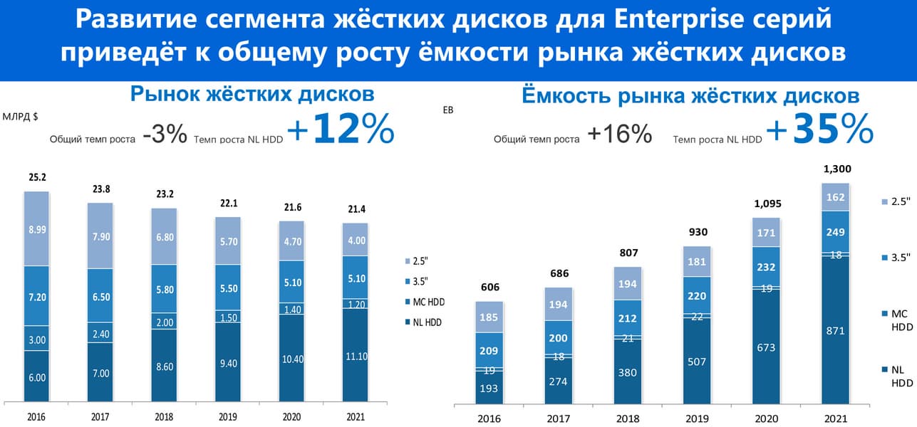 Объективный процесс, который со «штуками» и «долларами» тоже связан — через распределение их по областям. К примеру, три года назад безусловным лидером в «долларах» были ноутбучные винчестеры — их нужно было много, а стоили они не дешево (особенно в относительном исчислении). Сейчас доля винчестеров в ноутбуках схлопывается — и через пару лет от них останется лишь 40% былой роскоши. Естественно, это сокращает и весь рынок в денежном исчислении. Но зато на первое место начинают выходить nearline-модели, которые вместо своих скромных 23% выручки начнут генерировать более половины.