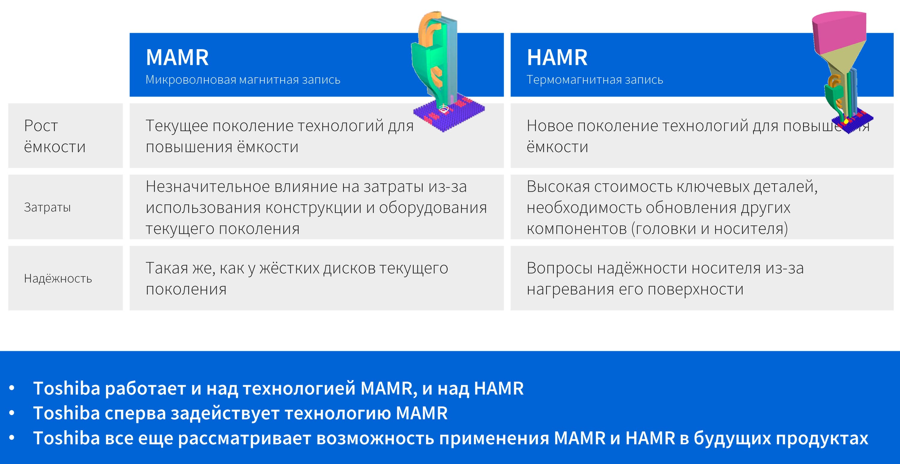 На данный момент Toshiba делает ставку на MAMR, причем обосновывает свое решение очень просто — внедрение данной технологии не слишком затрагивает сложившуюся инфраструктуру производства. HAMR теоретически более перспективна — но слишком много вопросов придется решать заново. В частности, потребуется менять и сами пластины, причем постоянное чередование циклов их нагрева и охлаждения заставляет задуматься об их надежности в течение длительного промежутка времени.