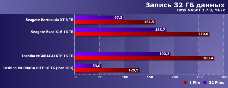 Как видим, так же можно поступать и сейчас. Не нужно, но можно. А в стародавние времена мы бы, возможно, еще и поругали MG08, и похвалили Exos X16... Впрочем, последний в этих тестах работает немного медленнее современных IronWolf меньшей емкости, так что хвалить и ругать вообще некого. Винчестеры и сейчас можно использовать в качестве универсальных накопителей — в том числе, и для хранения операционной системы и данных. Но «гоняться» за быстродействием в подобных сценариях, оптимизируя под них прошивку, производители давно уже не считают нужным. Тем более — в случае корпоративных серий, которым это не требуется в еще большей степени. Получилось быстро — ну, тоже пригодится. Получилось не очень быстро — ничего страшного. «Хуже» за прошедшие годы не стало, во всяком случае. А за «лучшим» идут уже на другие рынки — на которых, правда, не могут предложить целых 16 ТБ по вменяемой (даже с точки зрения физического лица) цене, так что одно другое компенсирует.