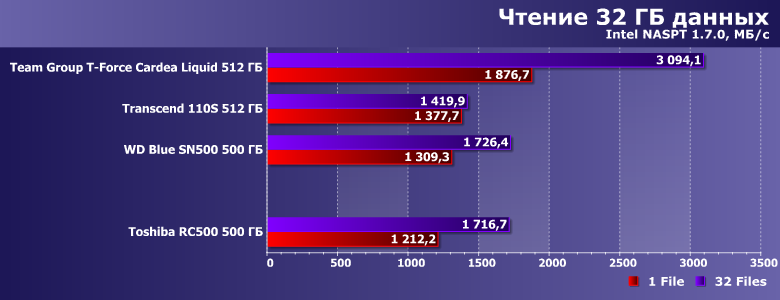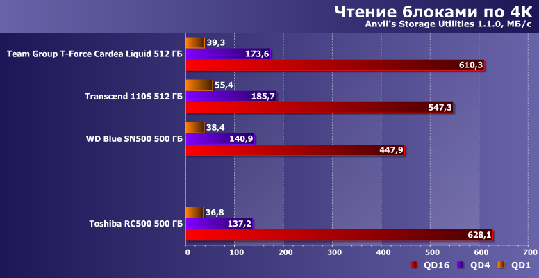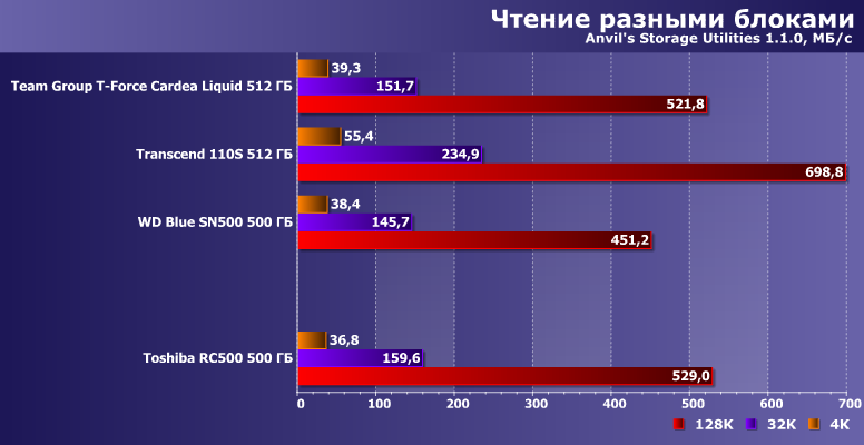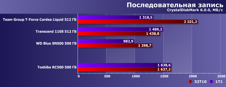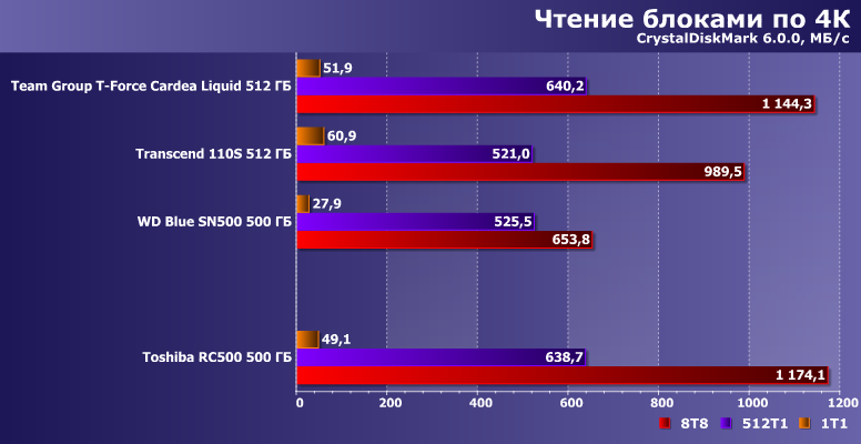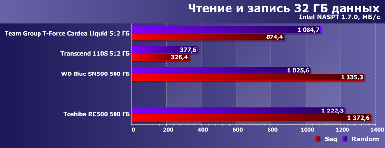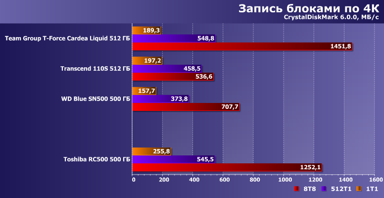 При записи же все еще хуже — тут и сама скорость взаимодействия с памятью может ограничить итоговую производительность. Во всяком случае, если выбирается устройство, емкостью 500 ГБ или менее — для этого сегмента «уберконтроллеры» не нужны. И Toshiba RC500 в итоге оказывается одним из самых быстрых из тестируемых.