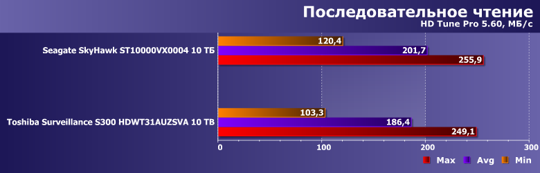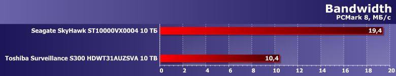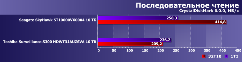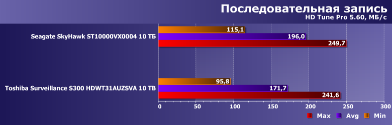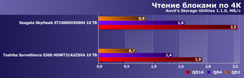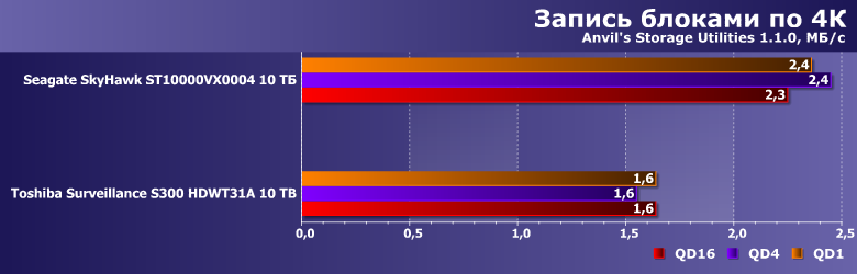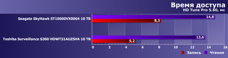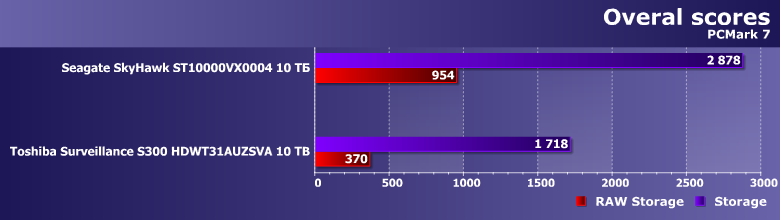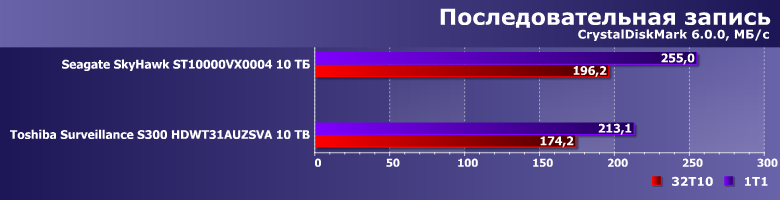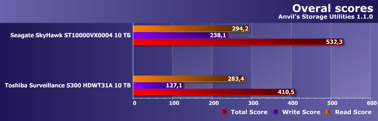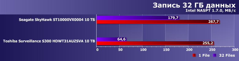 Тем более, что и результаты могут оказаться... немного неожиданными. Toshiba Surveillance S300 — современный винчестер на емких пластинах диаметром 3,5″ со скоростью вращения 7200 об/мин, но вот его производительность в качестве системного накопителя существенным образом уступает аналогичному по ТТХ Seagate SkyHawk Surveillance. А вот таковой ведет себя как раз идентично моделям Seagate для NAS и ПК, так что дело вряд ли в какой-то оптимизации прошивки. В гелии — возможно. Точнее, в работе механики, существенным образом от конкретной газовой среды, разумеется, зависящей.