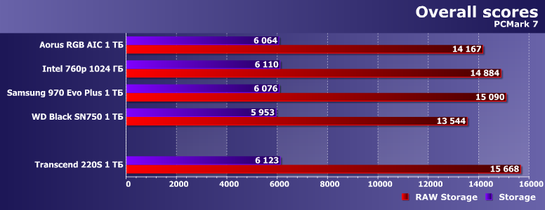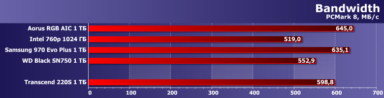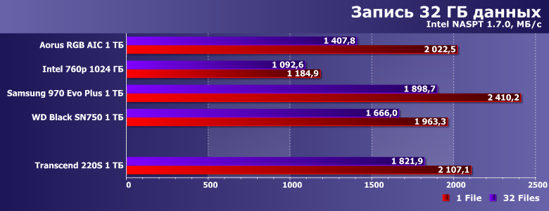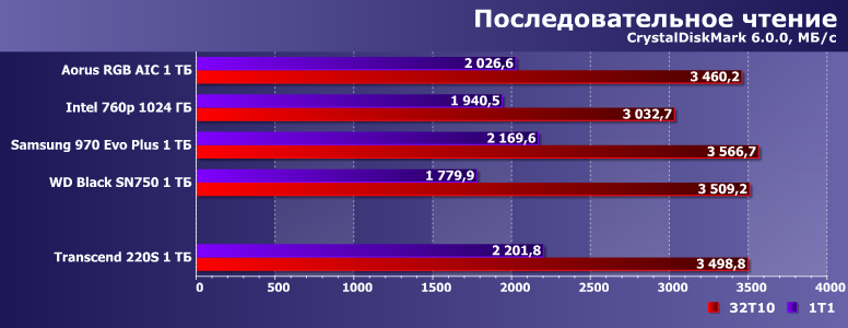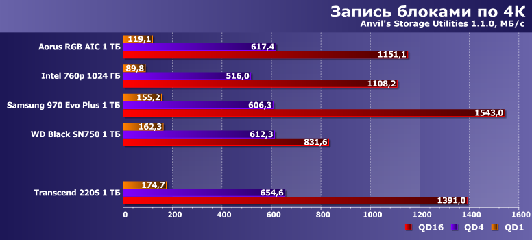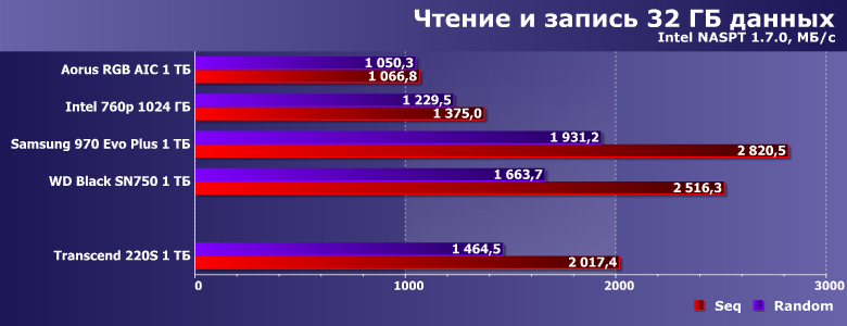 Недавно мы тестировали Aorus RGB AIC емкостью 1 ТБ. В качестве образцов для сравнения в упомянутом материале использовались Samsung V-NAND SSD 970 Evo Plus, Intel SSD 760p и WD Black SN750 аналогичной емкости. Именно эту четверку (точнее, ее результаты) мы и возьмем сегодня за образец. Благо 760р использует даже аналогичную память (хоть и с бо́льшими кристаллами при таком объеме) и почти такой же контроллер — «базовую версию» Silicon Motion SM2262, а не SM2262EN. Aorus RGB AIC — немного атипичный по исполнению представитель семейства устройств на базе Phison E12 (прямых конкурентов для моделей, основанных на SM2262/SM2262EN), но на производительности это не сказывается, а именно ее мы и сравниваем. Продукты же Samsung и WD в качестве реперных точек хороши просто сами по себе :)