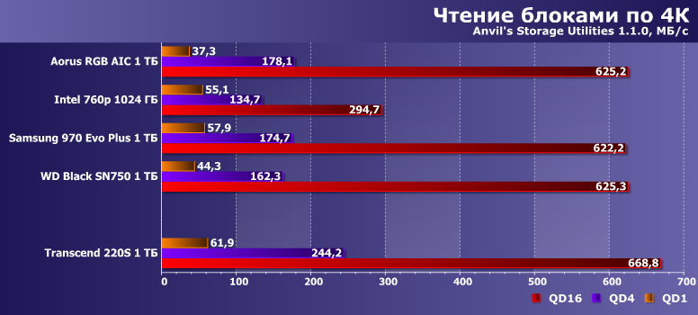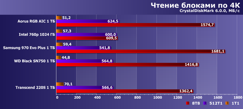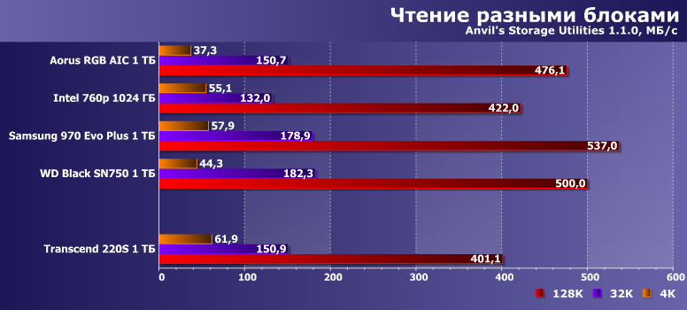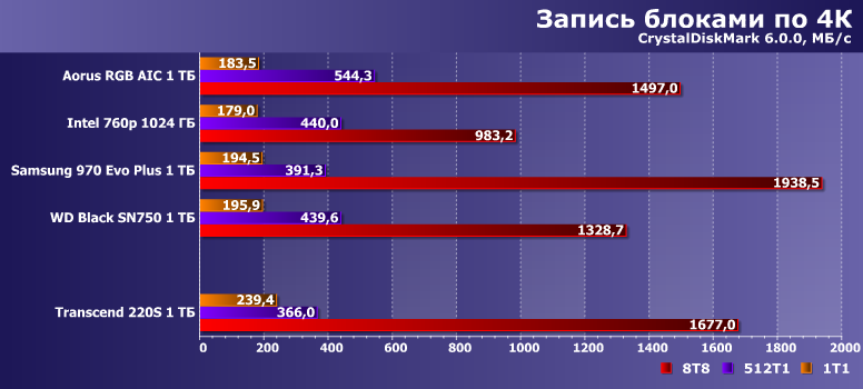 С точки зрения тестов низкого уровня, производительность Transcend 220S выше среднего при чтении данных и очень высокая при записи. От Samsung 970 Evo Plus он, конечно, отстает, но 960 Evo и даже 970 Evo обгоняет.