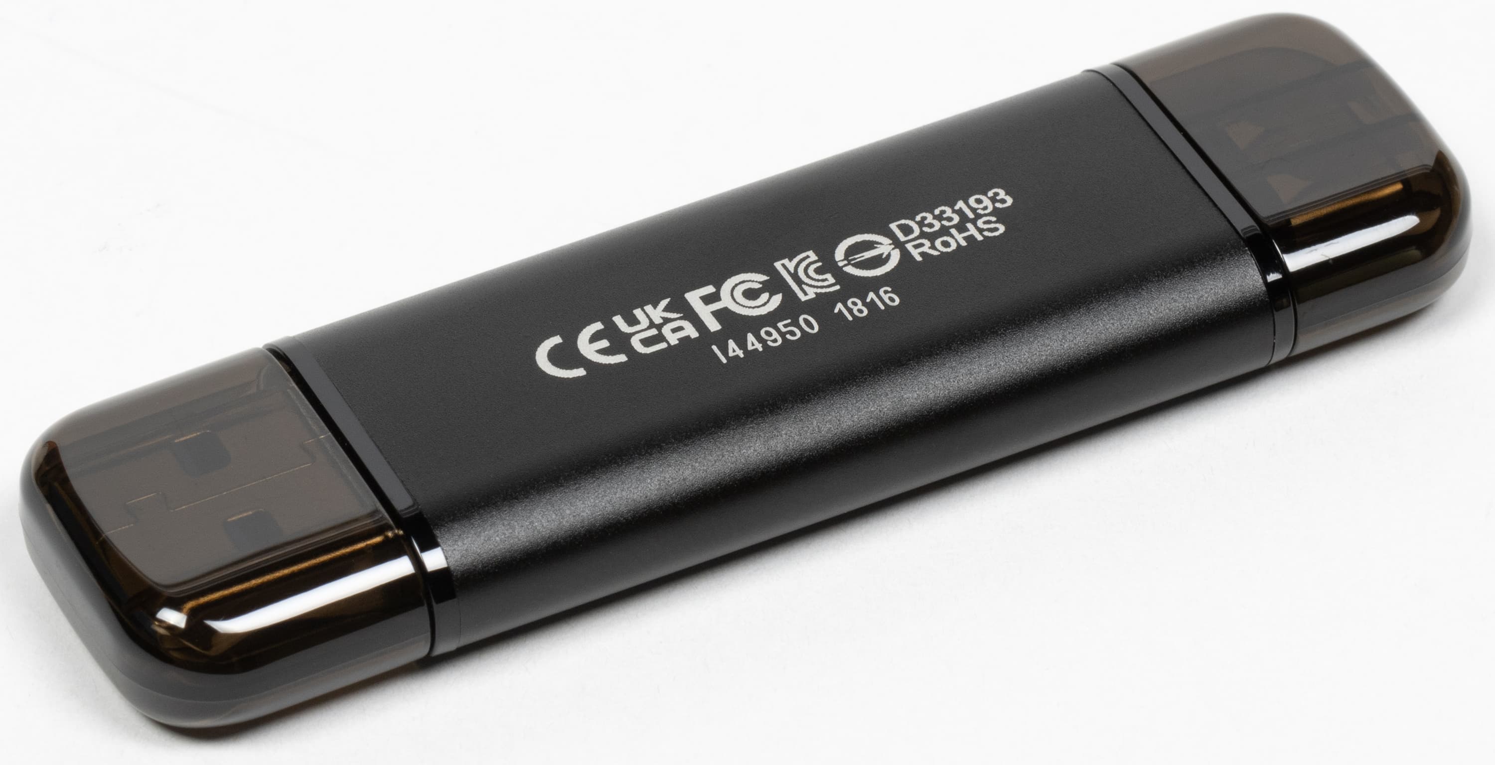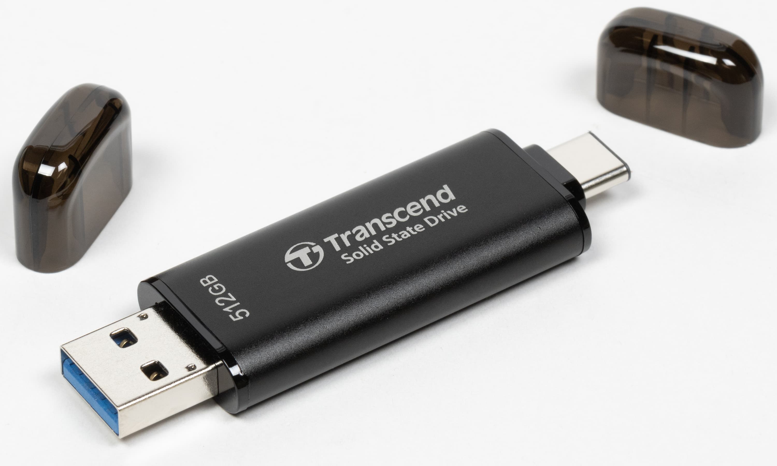 У ESD310, равно как и у 930C, есть младший укороченный брат с одним разъемом. Но если JetFlash 920C снабжался только Type-A, то на ESD300 именно он пошел под сокращение — остался только современный Type-C. Мы же считали и считаем, что два «жала» еще долгое время можно будет считать не просто достоинством флэшки, но и необходимостью. Даже сейчас выпускаются устройства только со старыми разъемами и только с новыми, так что возможность работы со всеми без переходников дорогого стоит. Если вы считаете иначе — можно получить сокращение длины флэшки на целый сантиметр, что тоже неплохо.