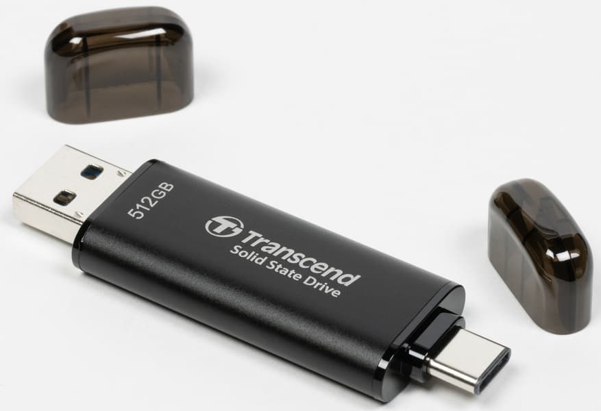Так что сами по себе эти устройства интересны и полезны. У них есть общие недостатки, в том числе иногда скорость записи даже в кэш может «залочиться» на уровне чуть выше 300 МБ/с. Мы как раз разбирали этот вопрос в прошлый раз, и Transcend ESD310 эта проблема тоже касается, поскольку пока ее можно считать общей для всей платформы. Но достоинств у таких устройств тоже много, а реализации могут быть очень разными. И вот в этой связи мы вынуждены покритиковать Transcend. Не за дизайн, хотя у него тоже есть огрехи, причем давние — зато флэшка получилась очень легкой и компактной. А за не слишком удачный выбор памяти, из-за которого эти модели работают медленнее, чем могли бы. Что ж, зато за ними хотя бы не нужно отправляться на AliExpress, что для многих покупателей и сейчас гораздо важнее, чем небольшая разница в скорости. Есть, конечно, в нашей рознице и другие аналогичные предложения, но почти все они ограничиваются одним интерфейсным разъемом, что, по нашему мнению, на сегодняшний день уже недостаток. А независимые USB Type-A и USB Type-C у Transcend ESD310 — явное преимущество.
