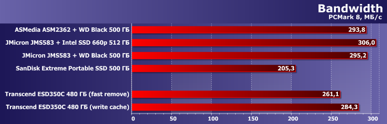 Сам же ESD350C мы тестировали как с включенным, так и с выключенным кэшированием записи. Просто потому, что последний раз сравнивали эти два режима на примере связки USB—SATA — а вдруг более быстрый вариант не так страдает от отсутствия кэширования? :) Или страдает — но размер «страдания» тоже полезно оценить. Равно как и снижение производительности на «забитом» данными устройстве: динамический SLC-кэш — это, конечно, хорошо, но несколько завышает скорости при тестировании. Поэтому тесты работы с большими файлами мы проводили как на «пустом» устройстве, так и оставив на нем свободными всего 100 ГБ, также подвергнув им и связку JMicron JMS583 с WD Black 2018 на 500 ГБ и Intel SSD 660p емкостью 512 ГБ на базе QLC-памяти, который мы добавили и к «основной» части. Последний в любом случае стоило протестировать в качестве потенциального носителя для внешнего накопителя, благо стоят представители этой линейки даже дешевле, чем «приличные» SATA-устройства такой емкости, гарантийный срок — длинный, да и быстродействие потенциально может оказаться неплохим. Но не всегда: серьезные просадки скорости записи должны быть и в этом случае. Вот и сравним их с ESD350C.