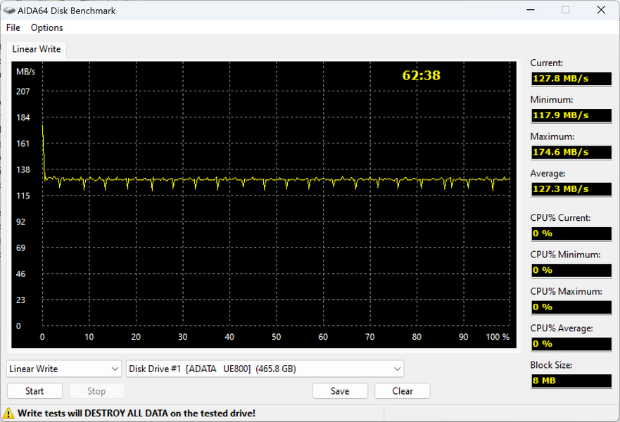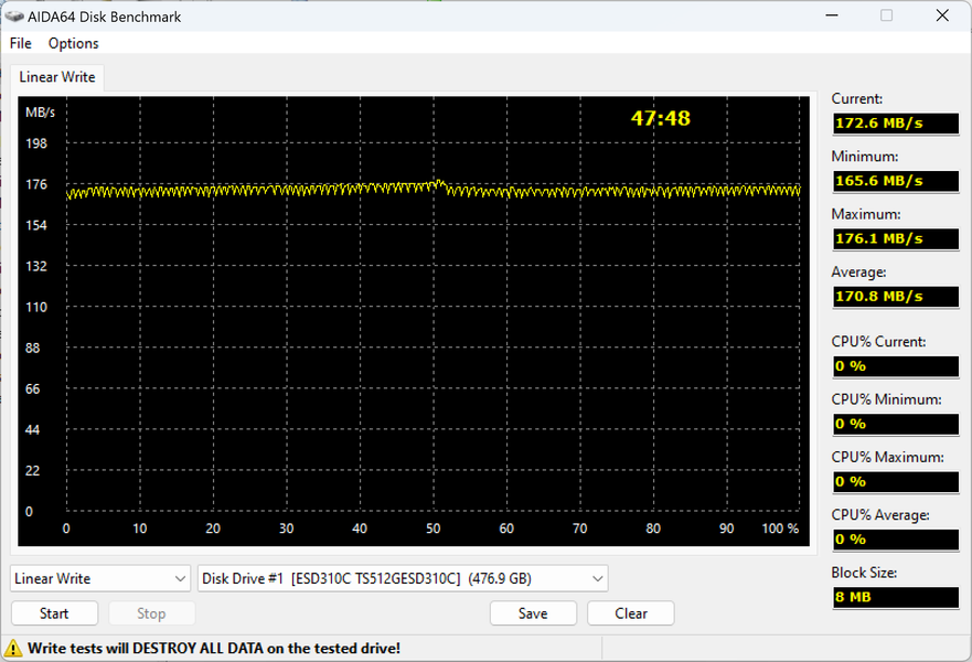 Что изменилось с новой прошивкой? Время выполнения теста радикально уменьшилось — теперь ESD310 обгоняет UE800. Максимальная скорость записи в кэш, правда, тоже немного уменьшилась, да и сам он сократился в полтора раза — то есть на максимуме уже удастся записать меньше данных. Но второе неизбежно: при изначальной схеме кэширования данные по исчерпании кэша писать напрямую некуда. Теперь же есть куда — и почти половина емкости проходится на скорости примерно 170 МБ/с. Потом всё равно приходится расчищать кэш, так что возвращаемся к тому, что было. Кроме того, небольшая ступенька на графике возникает из-за того, что, по-видимому, контроллер в таком режиме немного перегрелся. Но, несмотря на это, ускорение налицо. И оно могло бы быть намного больше, будь память побыстрее. С другой стороны, это делает более оправданной покупку ESD310 большей емкости. Ранее это было не слишком интересно, поскольку все варианты с такой политикой тормозили одинаково. А теперь скорость прямой записи будет разной, и более высокой — у «флэшек» на 1 и 2 ТБ.