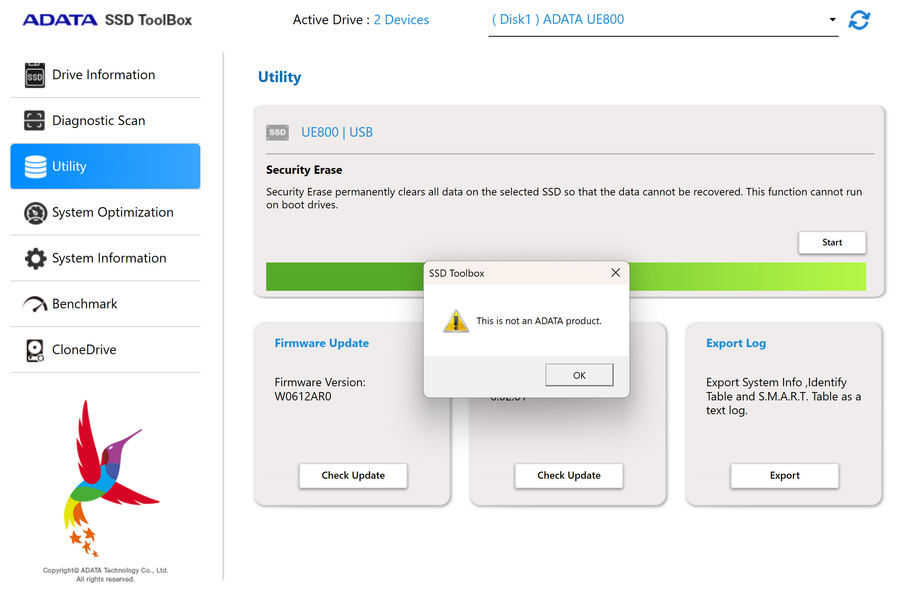 Впрочем, когда-то Kingston прошивки своим устройствам обновлял — не через отдельную программу, а через общую и для внутренних SSD утилиту. Однако последний раз такое случалось в декабре 2022 года, с тех пор ничего не меняется. У Adata специальной утилиты нет, а общий Toolbox выдает вот такие оскорбительные сообщения. На MoveSpeed мы, естественно, изначально не рассчитывали :) Так что остается только Transcend. И сейчас мы «нового» мальчика измерять будем.