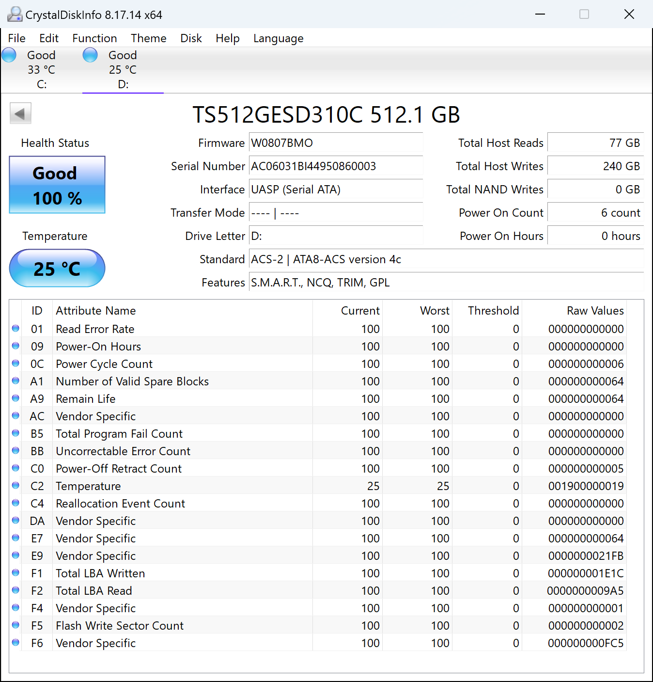 | Transcend ESD310 512 ГБ (W0807) | 830,5 | 817,3 |