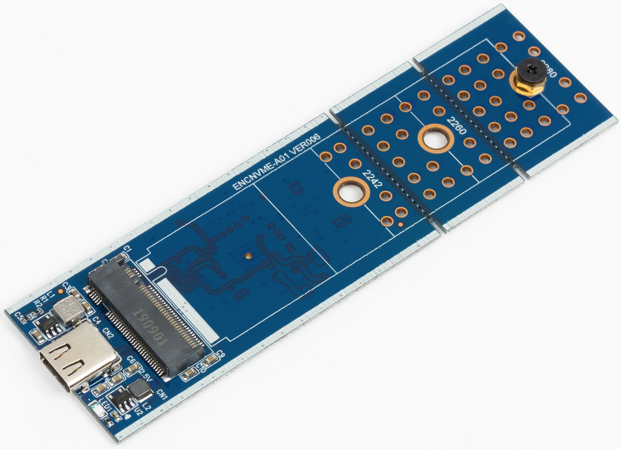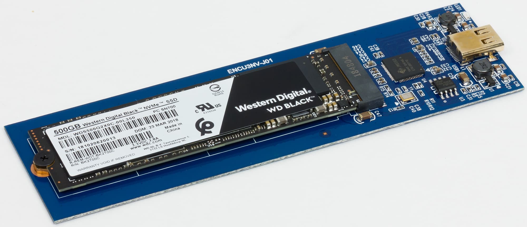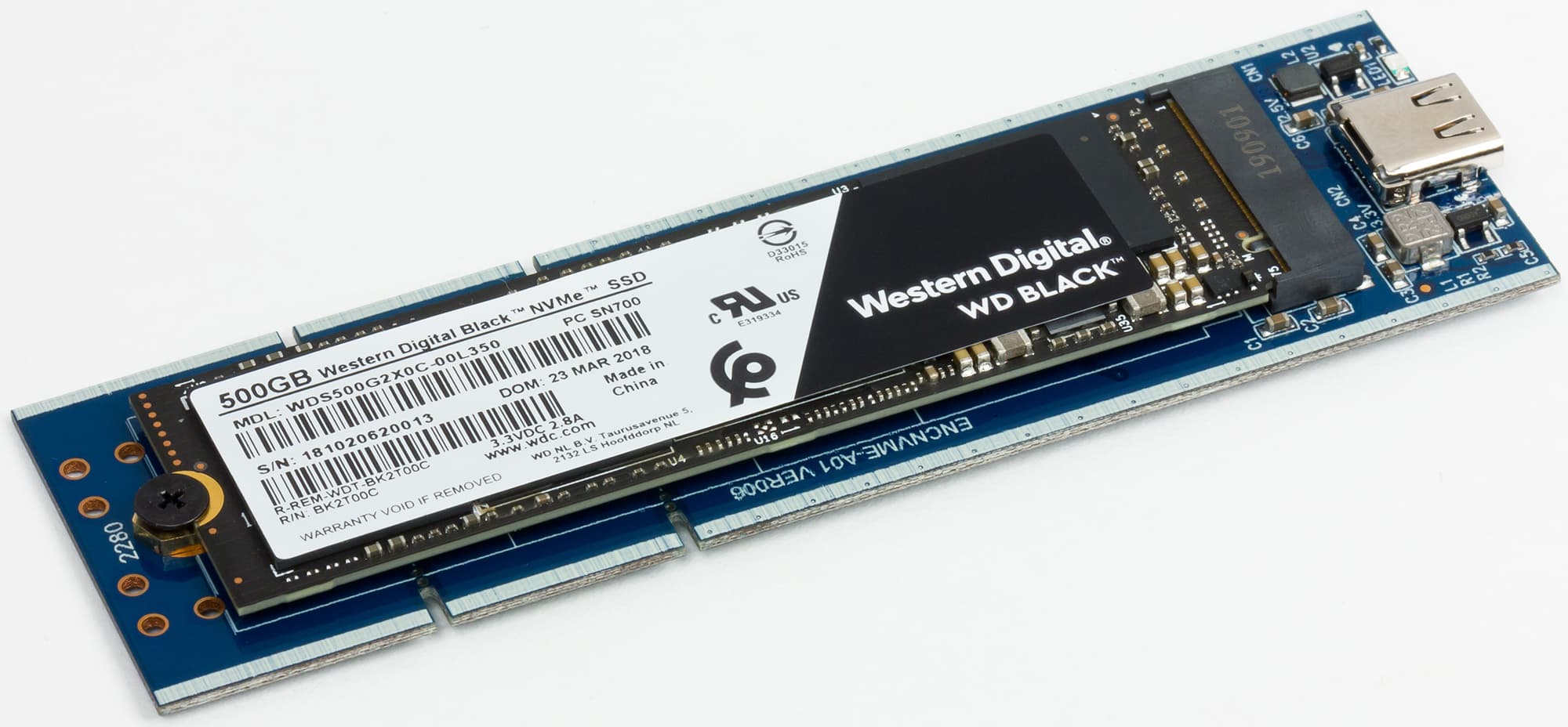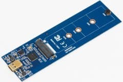 Вскрытие показало, что связано это с разной конструкцией основной платы: в первом случае контроллер стоит между разъемами USB и M.2, а во втором — на обратной стороне платы. В любом случае это, конечно, куда компактнее внешних винчестеров, однако несколько пугает на фоне того же Samsung T5. В первую очередь из-за того, что карты M.2 могут быть длинными — до 80 мм (даже до 110, но этот вариант достаточно экзотичен), причем именно на такие и приходятся основные объемы продаж, так что производителям пришлось озаботиться поддержкой всех вариантов. Вот если ориентироваться на продажи готовых изделий, тут, пожалуй, есть смысл «заточиться» под Toshiba BG3 с его габаритами 22×30 мм :) С другой стороны, корпуса под SATA M.2 на данный момент обычно тоже «страдают» той же универсальностью, что приводит и к аналогичным солидным габаритам, но в этом случае есть какое-никакое предложение для карт формата 2242 (без более крупных). Под PCIe — нет.