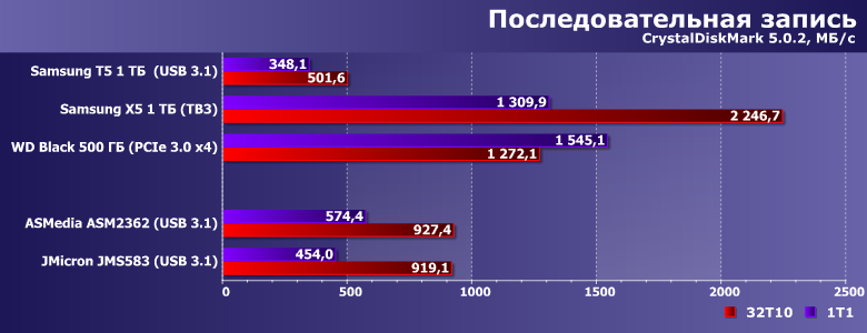 Если же убрать ограничения со стороны ПО, то, все же, не ровно — а ближе к нижнему краю. Но это просто у нас диапазон такой получился — смещенный вверх. Ниже Samsung T5 и других внешних SSD есть еще масса всяческих накопителей — вплоть до бюджетных флэшек или любых винчестеров, демонстрирующих зачастую на порядок более низкую скорость. А JMicron JMS583 и ASMedia ASM2362 позволяют получить не меньше, а заметно больше.