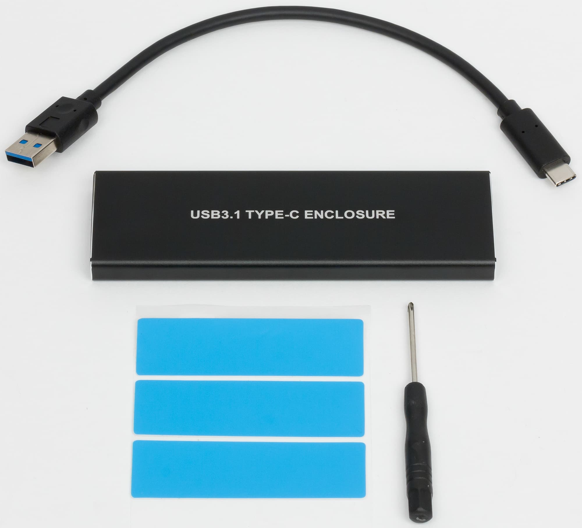 Комплект поставки в обоих случаях идентичный и трогательно-исчерпывающий: отвертка, 20 см кабель USB А—C и три теплопроводящих наклейки — поскольку многие NVMe-накопители сильно нагреваются. К сожалению, как выяснилось, ASM2362 и сам по себе тот еще горячий парень, так что об отводе тепла от него имеет смысл позаботиться всегда, когда потребности выходят за рамки простого копирования десятка-другого гигабайтов файлов. JMS583 в работе куда холоднее (вот оно — потенциальное обоснование более высокой цены :)).