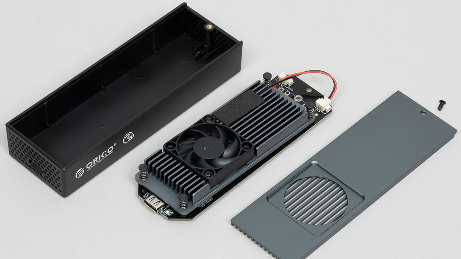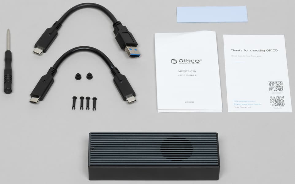 Если же не считать поддержки скоростного интерфейса и оригинальный подход к охлаждению, это абсолютно типичный продукт с AliExpress. Разве что (что привычно для Orico) качественно упакованный — и хорошо укомплектованный. В частности, компания не слишком экономит на кабелях, вкладывая в комплект оба нужных. Отвертка и прочие мелочи тоже на месте — причем держатели для радиатора и самого SSD на всякий случай в удвоенных количествах.