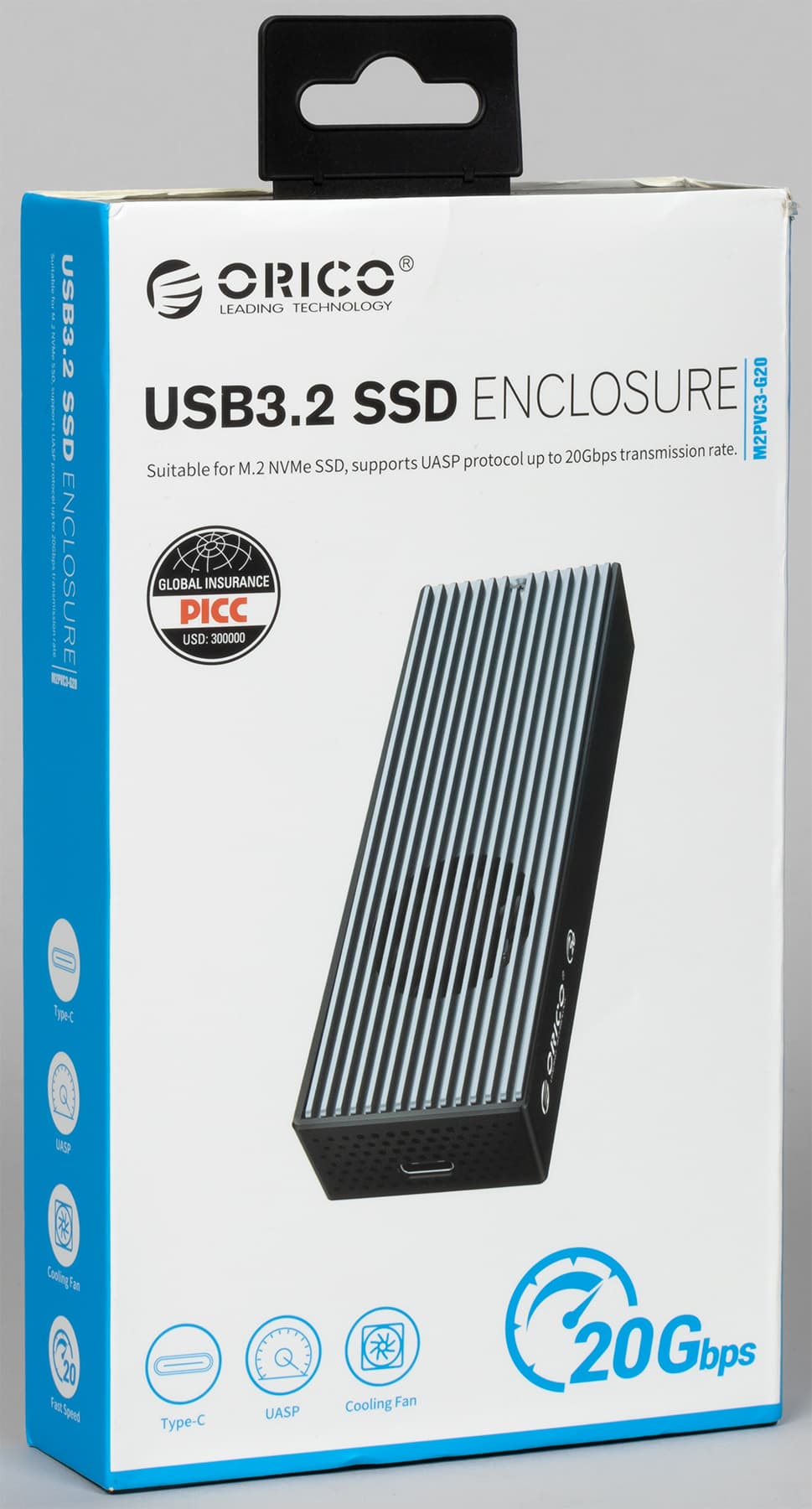 А тут на глаза попалась коробка с активным охлаждением SSD. Крупненькая (115×40×23 мм при массе 84 г), но в данном случае это не пугало — все-таки самые быстрые накопители больше ориентированы на длительное (возможно — даже постоянное) подключение к компьютеру, чем на перенос нескольких файлов. Да и готовые внешние SSD с этим интерфейсом тоже большие — из-за необходимости обеспечить нормальное охлаждение. Законы физики неумолимы — низкое тепловыделение только у медленных (или очень медленных) устройств. Либо быстрых — но работающих в замедленном режиме. Так что, если нужен внешний накопитель под USB3 Gen1 — можно использовать все, что угодно, и не беспокоиться. А с USB3 Gen2×2 такое уже чревато проблемами.