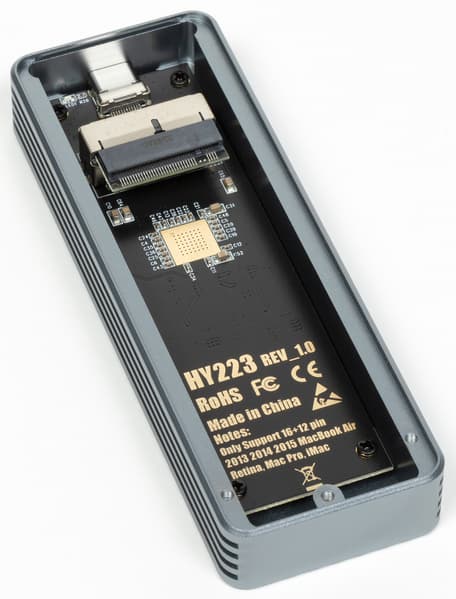 Главной его киллер-фичей, напомним, является поддержка не только NVMe-, но и AHCI-протокола, а такие SSD активно использовались Apple. Со своим фирменным разъемом 12+16, так что именно под него рассчитаны все такие коробки. А в комплекте лежит переходничок для установки в такой разъем обычно SSD в формате M.2 2280. То есть такой upgrade kit для MacBook — покупаем его и новый SSD, с помощью переходника устанавливаем SSD в ноутбук, а старый помещаем в USB-коробку и продолжаем пользоваться как быстрым внешним.