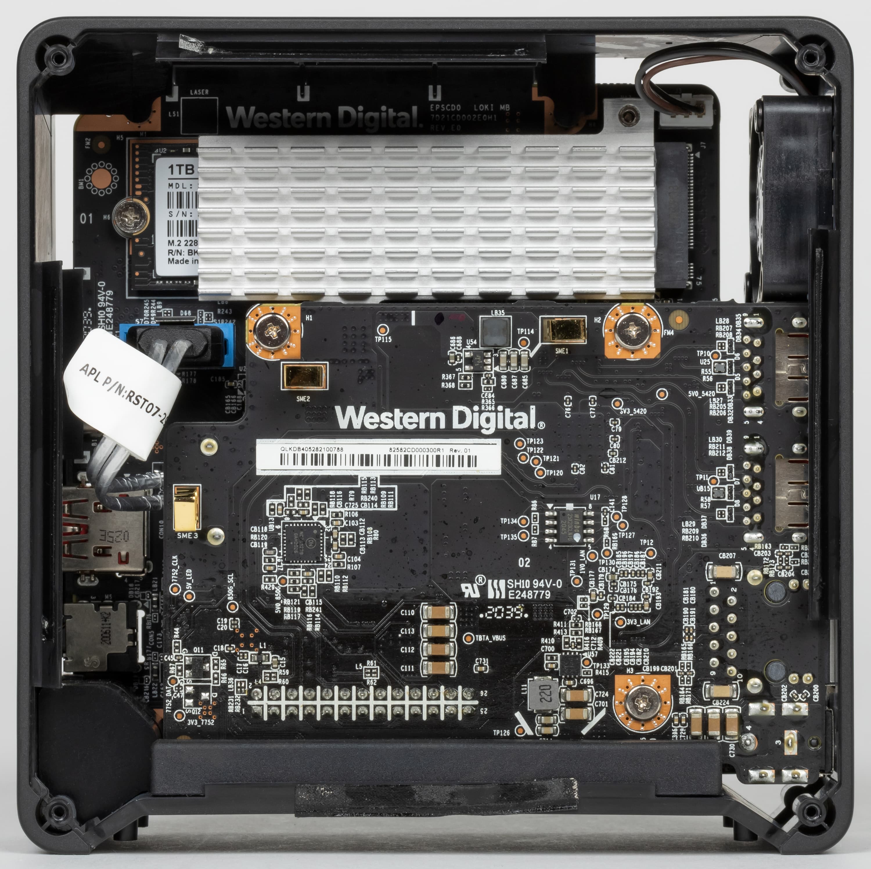 Что же касается SSD, то с ним все просто — на плате установлен слот M.2. Свободный в «пустом» доке — либо занятый SN730 на 1 или 2 ТБ. Во втором случае также есть и небольшой радиатор — насчет первого точной уверенности нет.