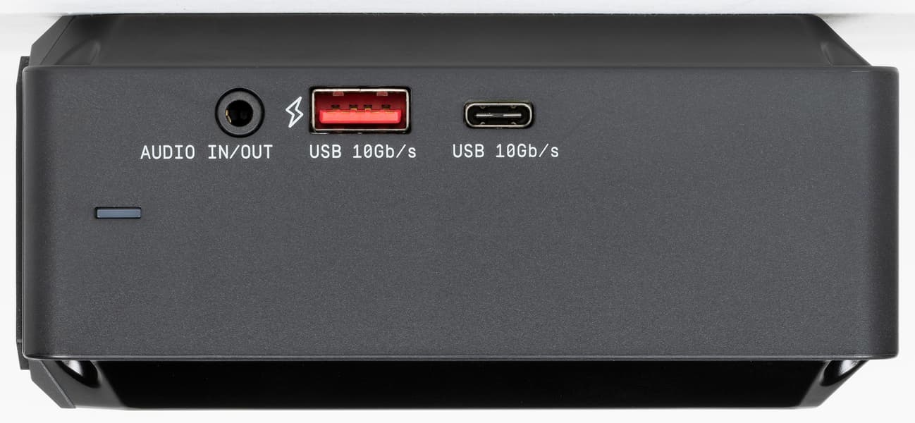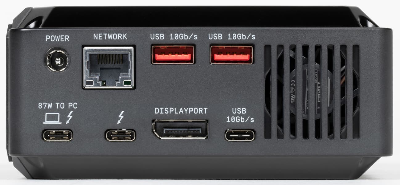 Коммутационные возможности дока включают, в частности пять портов USB3 Gen2: А+С спереди и еще два А и один С сзади. Можно считать, что там даже два последних — D50 поддерживает цепочечное подключение Thunderbolt-устройств, так что, когда таковое не требуется (что будет часто выполняться — накопитель уже внутри, внешнюю видеокарту так подключать не стоит), соответствующий порт можно использовать просто как дополнительный USB или видеовыход.