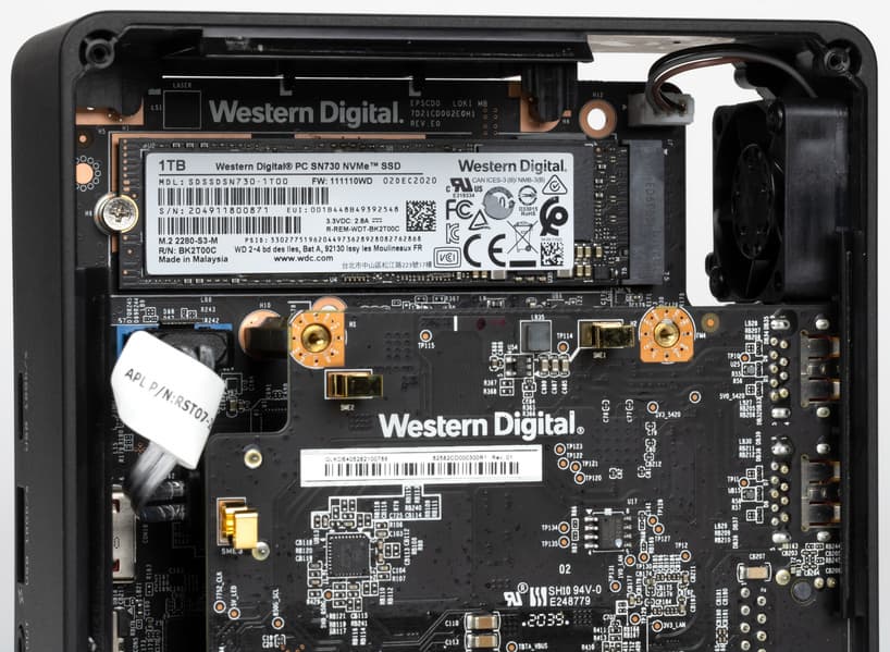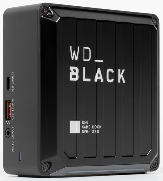 Словом, с точки зрения основной функциональности WD D50 Game Dock — это совершенно обычный Thunderbolt-док, продающийся за «стандартные» ≈20 тысяч рублей. WD D50 Game Dock NVMe SSD 1 ТБ стоит уже порядка 32 тысяч — но отдельный WD Black SN750 (а это ближайший розничный аналог SN730) такой емкости в продаже как раз с 12 тысяч рублей и начинается. А сколько будет стоить сам по себе внешний SSD с интерфейсом Thunderbolt? Такие продукты в нашей рознице относительно редки, но есть, например, в свое время изученный нами Samsung X5. Терабайтная модификация до сих пор продается от... 22 тысяч рублей. Дешевле, конечно, отправиться на Aliexpress — но и там цена коробочек под Thunderbolt начинается с 5 тысяч рублей, т. е. вместе с каким-либо доком (а стоят они все, как уже сказано, сопоставимо) и SSD это уже обойдется заметно дороже, чем WD Game Dock NVMe SSD. Так что, если нужно всё, но не требуется носить с собой дополнительный SSD повсеместно, предложение WD выглядит очень привлекательно. Поэтому с ним имеет смысл познакомиться поближе — как раз в плане оригинальных особенностей. А таковой является в первую очередь твердотельный накопитель.