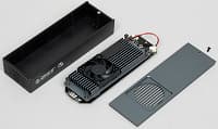 При этом вся конструкция обдувается небольшим вентилятором — попутно обеспечивающим циркуляцию воздуха и в отсеке под основной платой.
