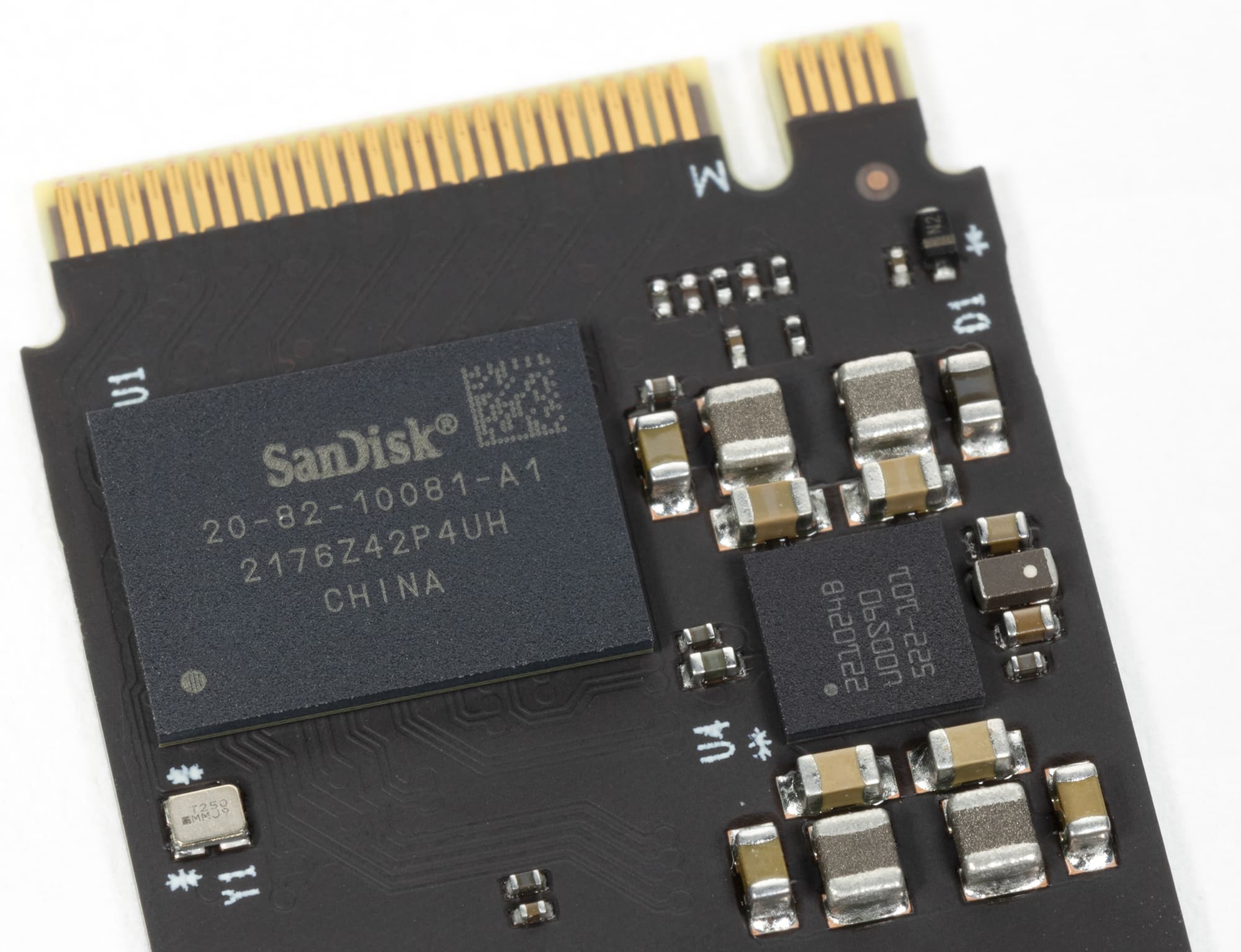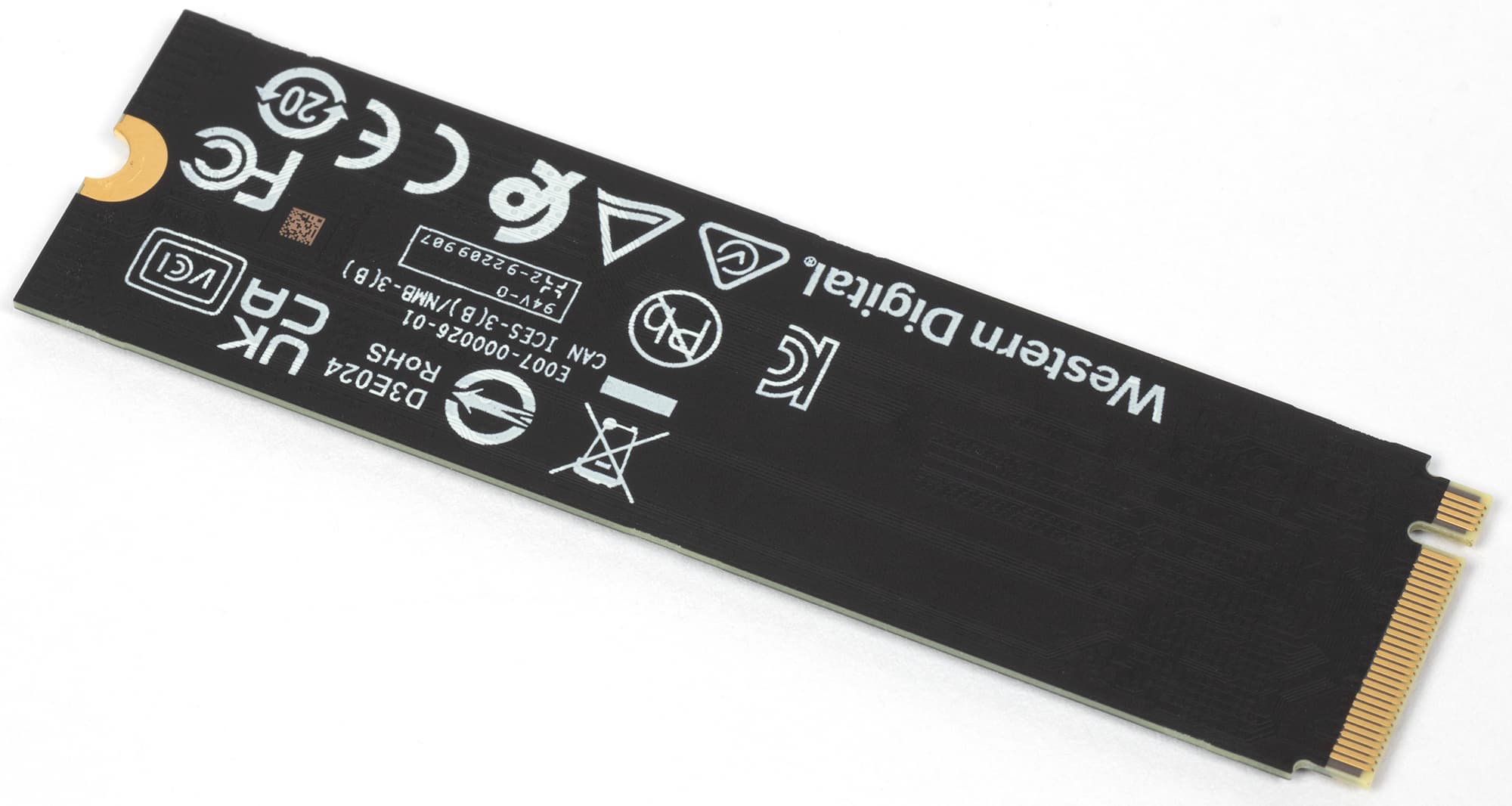 Внешне изучать даже и нечего — как мы не раз уже упоминали, большинство SSD WD выглядят своеобразно по меркам рынка, зато друг на друга похожи как две капли воды. Разве что наклейки в разных линейках разного цвета, а компоновка хоть у самых дешевых Green SN350, хоть у старших Black SN770 идентичная. Про Blue и говорить не приходится — двухчиповый (контроллер + одна микросхема флэша) подход впервые появился как раз в Blue SN500, а в SN550 обе микросхемы разнесли по разным краям платы M.2 2280 и с тех пор ничего внешне не меняется. Кроме наклеек и маркировок.