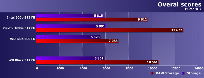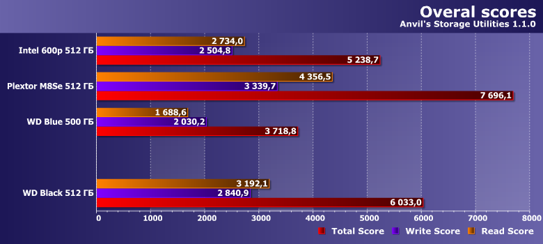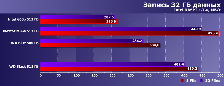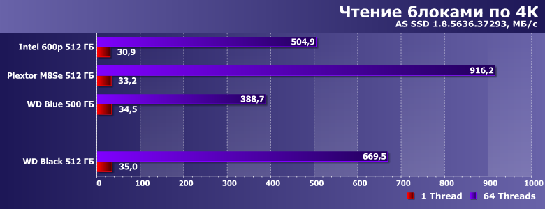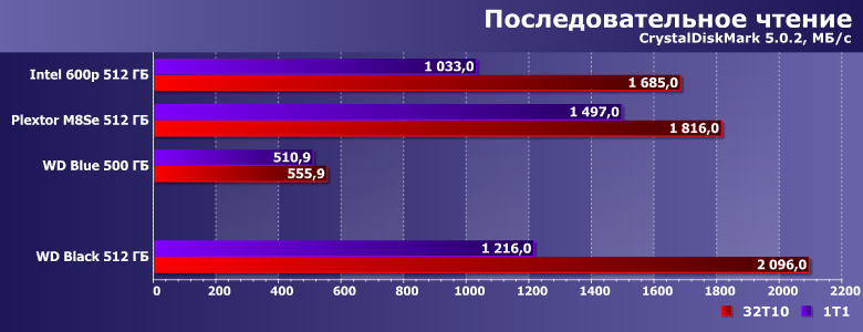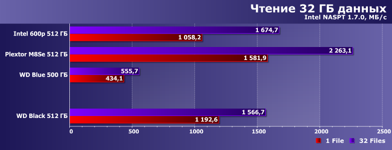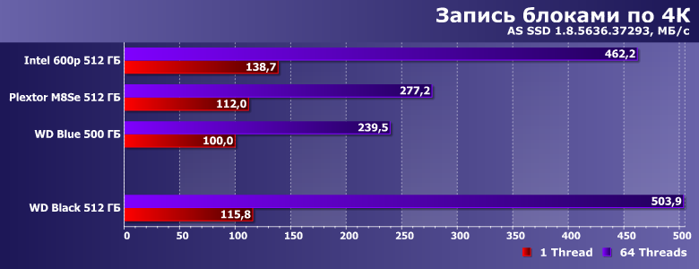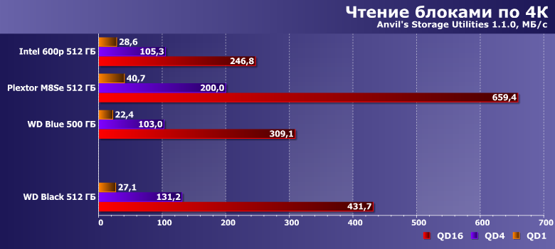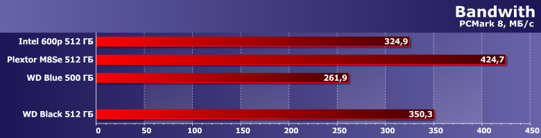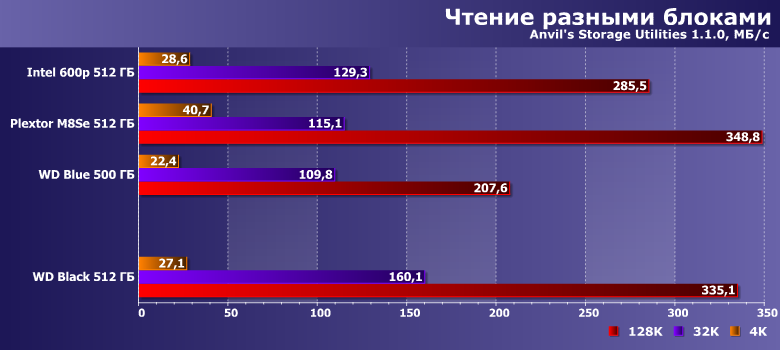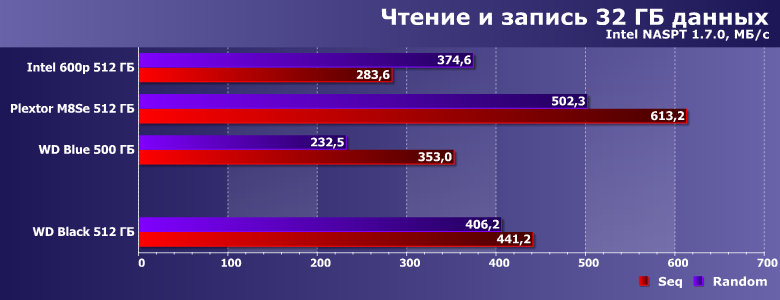 | Intel SSD 600p 512 ГБ | Plextor M8SeGN 512 ГБ | WD Blue 500 ГБ | WD Black 512 ГБ |