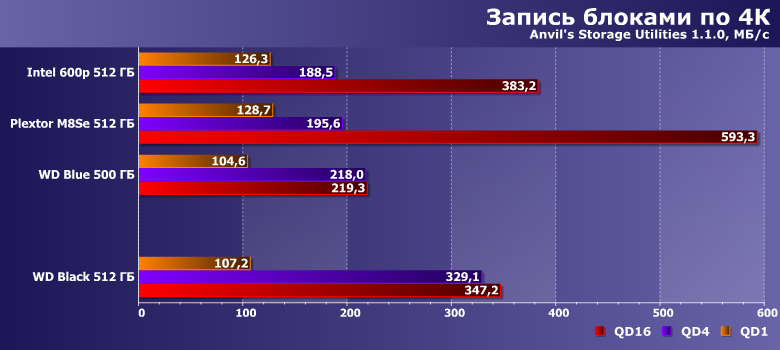 Разница между этими двумя программами определяется как разной глубиной очереди, так и выбранными в настройках размерами «рабочей области». Впрочем, принципиально это картину не меняет: WD Black демонстрирует нормальные для своей цены результаты, в среднем опережая Intel 600p или, тем более, WD Blue с SATA-интерфейсом, но вот от Plextor M8Se на сходной элементной базе нередко заметно отстает. Но не всегда.