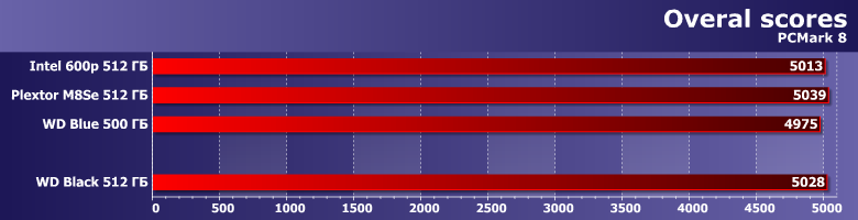 Традиционно в тестах высокого уровня все примерно равны. Причина тоже не раз озвучена — твердотельные накопители «узким местом» в системе не являются. Впрочем, как видим, тройка NVMe-устройств за психологическую отметку в 5000 баллов переваливает, а «обычный порошок» в лице WD Blue до нее немножко не дотягивается.
