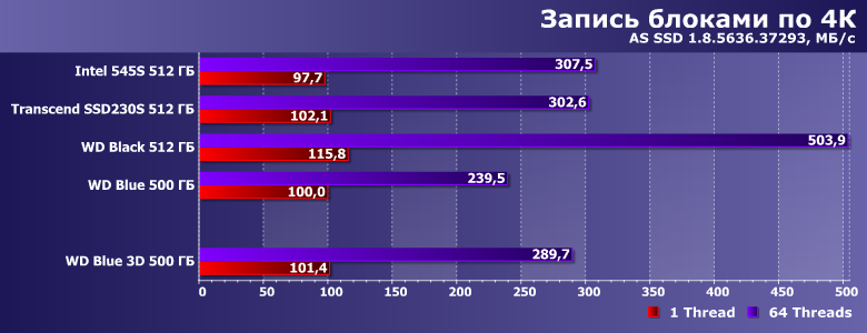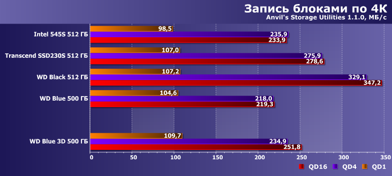В среднем на низкоуровневых операциях показатели быстродействия улучшились. В итоге обновленный Blue 3D вышел на неплохой для современного накопителя уровень производительности. Обычный же Blue немного, но отставал от такового.