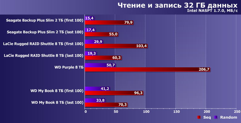 Включая и то, что в более-менее сложных случаях скорость начинает зависеть от RAID-контроллера, так что Rugged RAID Shuttle оказался самым медленным в многопоточном режиме, хоть и лидирует в чисто последовательном. К нашему герою, вообще говоря, есть некоторые замечания в плане несимметричности чтения и записи — и некоторого отставания от внутреннего Purple. Вообще картина напоминает ранние модели с SMR, хотя в «восьмерках» WD ранее эта технология замечена не была (вот «начинка» My Book на 4 и 6 ТБ точно «черепичная»). Впрочем, сравнению с портативными ВЖД это все равно не слишком мешает — они-то давно уже поголовно SMR. А окончательные выводы отложим до файловых операций.