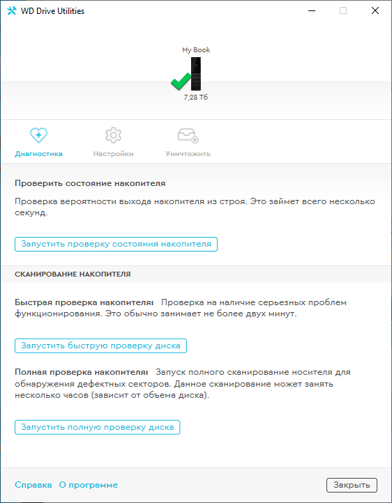 WD Drive Utility позволяет контролировать состояние накопителя, настраивать время его перехода в спящий режим или очищать жесткий диск с последующим форматированием в одну из двух файловых систем — NTFS или exFAT.