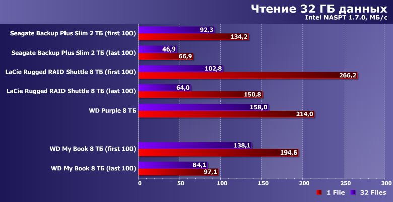 Но главное — внешние же Seagate Backup Plus Slim 2 ТБ и LaCie Rugged RAID Shuttle 8 ТБ. Первый — типичный портативный внешний жесткий диск со всеми своими особенностями. Второй — массив из пары подобных, на что пришлось идти ради увеличения скорости и емкости при сохранении USB-питания. Вот и сравним такой сложный (и дорогой!) путь с простым «лобовым» — десктопным винчестером на те же 8 ТБ.