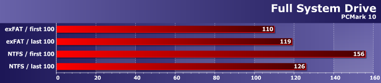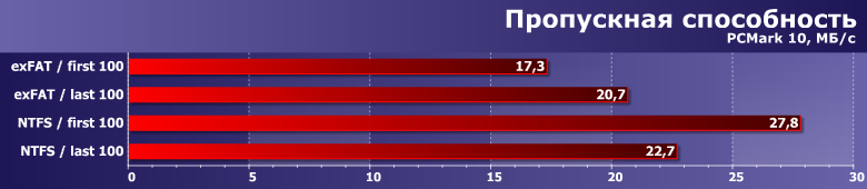 В общем, отдельный материал, посвященный PCMark 10 Storage, у нас будет. Вводить программу в рабочий цикл мы тоже будем — очень интересна в качестве комплексной оценки потребительских характеристик. Пока же стадия тестирования самого пакета — который мы применили и в этом случае. Для одной из любимых тем — сравнение файловых систем: exFAT и NTFS. Именно первая и используется по умолчанию, для хранения данных подходит отлично — а что с «рабочими» нагрузками? Понятно, что во многом это теория — поскольку установить Windows на exFAT, к примеру, на практике не получится, но... Причем отметим, что новая версия дискового теста в отличие от предыдущих для такого сравнения подходит — она работает с «реальными» файлами, а не дисковыми трассами, «загнанными» в один большой виртуальный файл.
